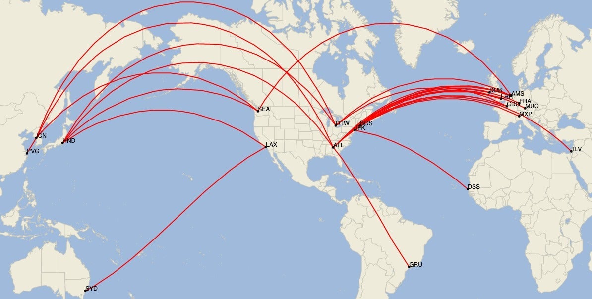 - Detroit (DTW) – Amsterdam, Paris Charles de Gaulle, Seoul Incheon, Shanghai Pudong (PVG) via Seoul, and Tokyo Haneda