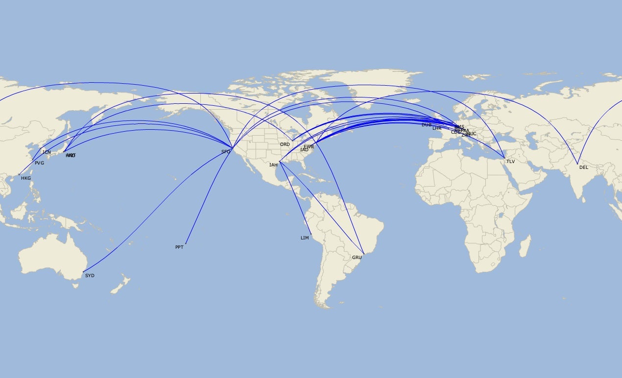 - Newark (EWR) – Amsterdam, Brussels (new), Delhi (DEL), Dublin, Frankfurt, London Heathrow, Munich (new), Paris Charles de Gaulle, São Paulo Guarulhos (new), Tel Aviv and Tokyo Narita