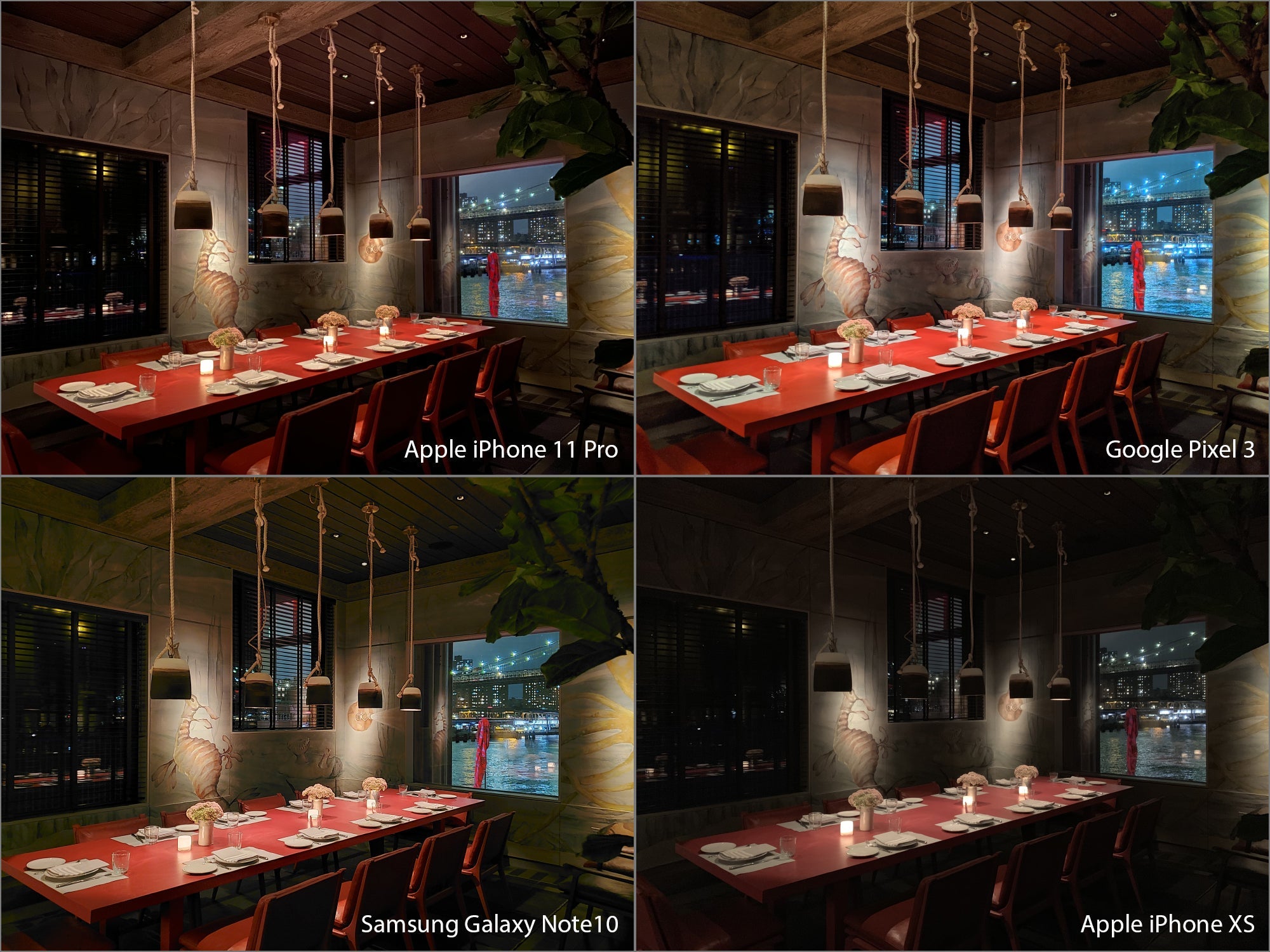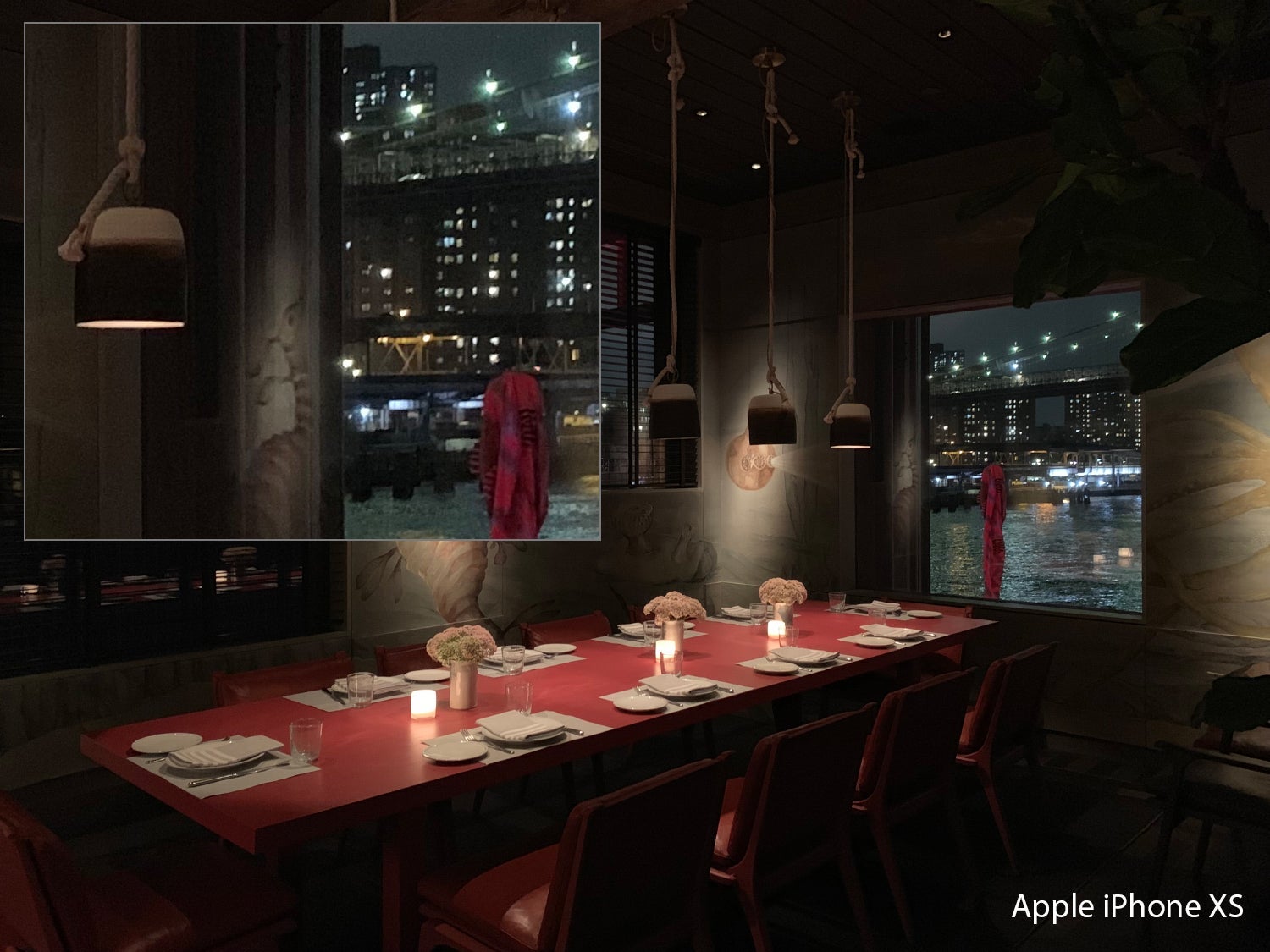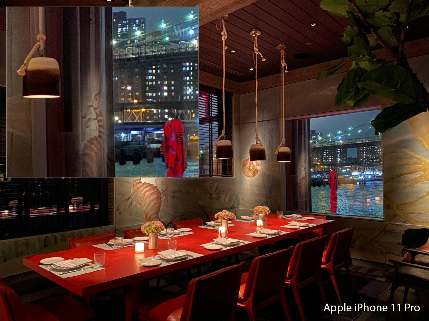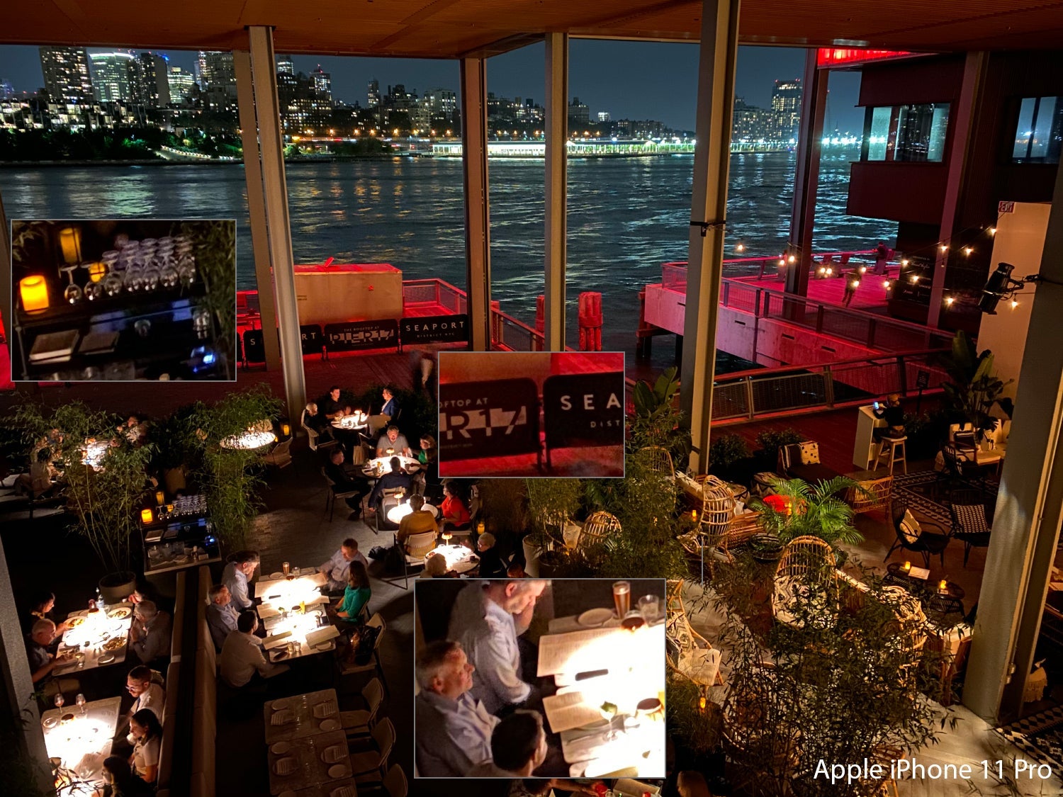 With this first scene, in a private dining room at The Fulton in New York City, I was most impressed with the iPhone 11 — details are incredibly sharp both inside the very dim room and out, with balanced exposure and colors.