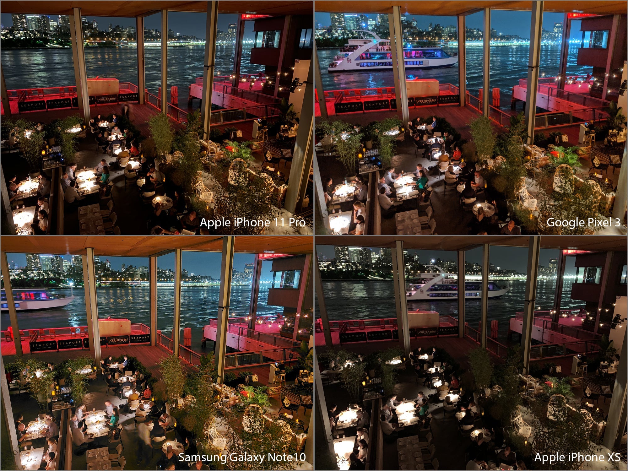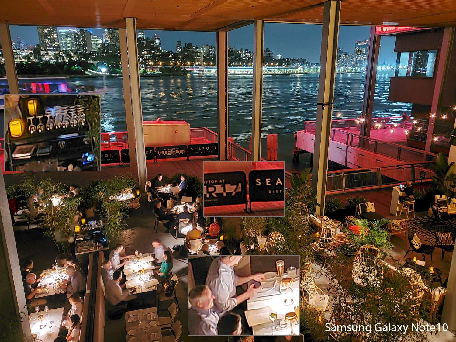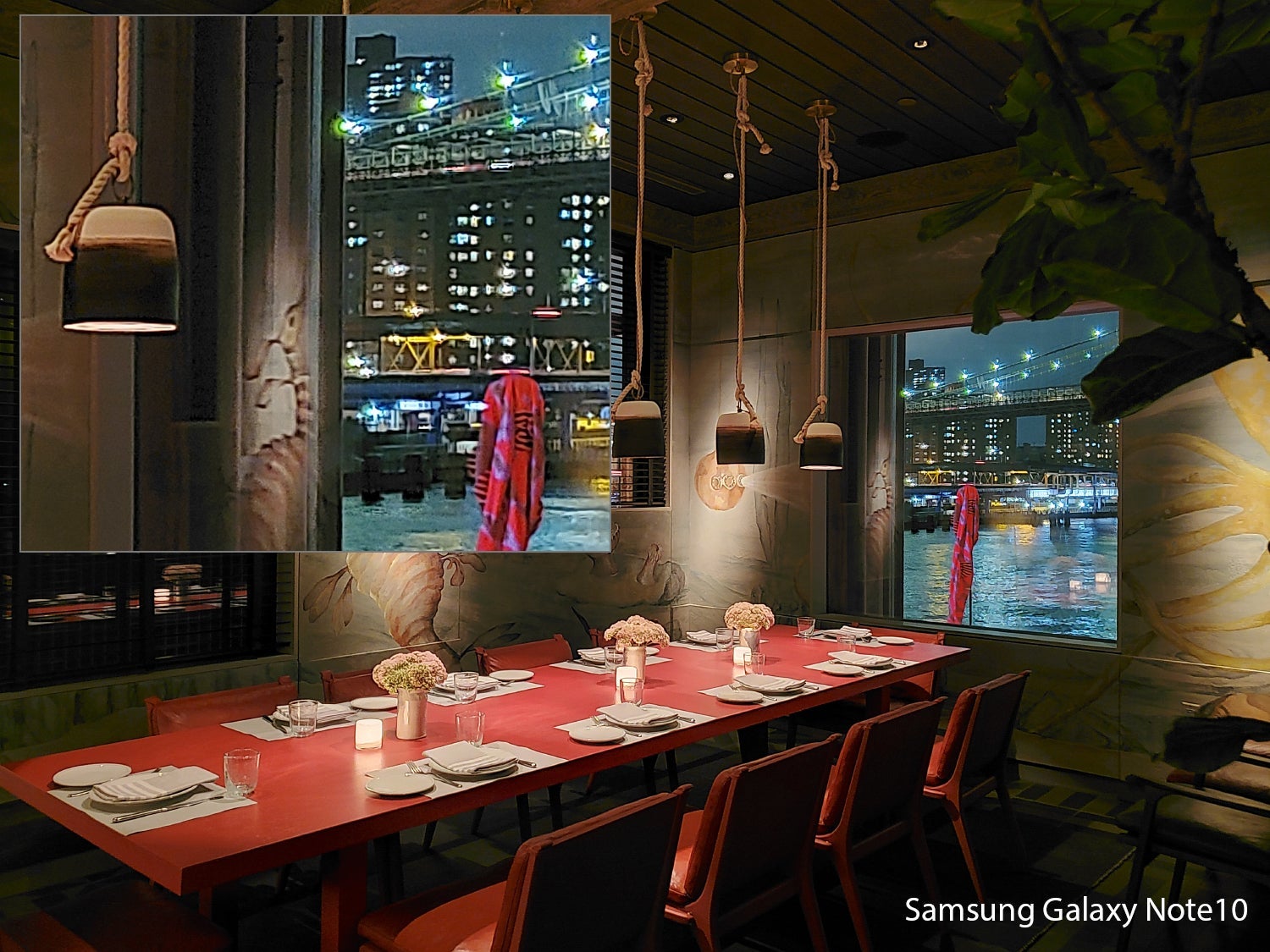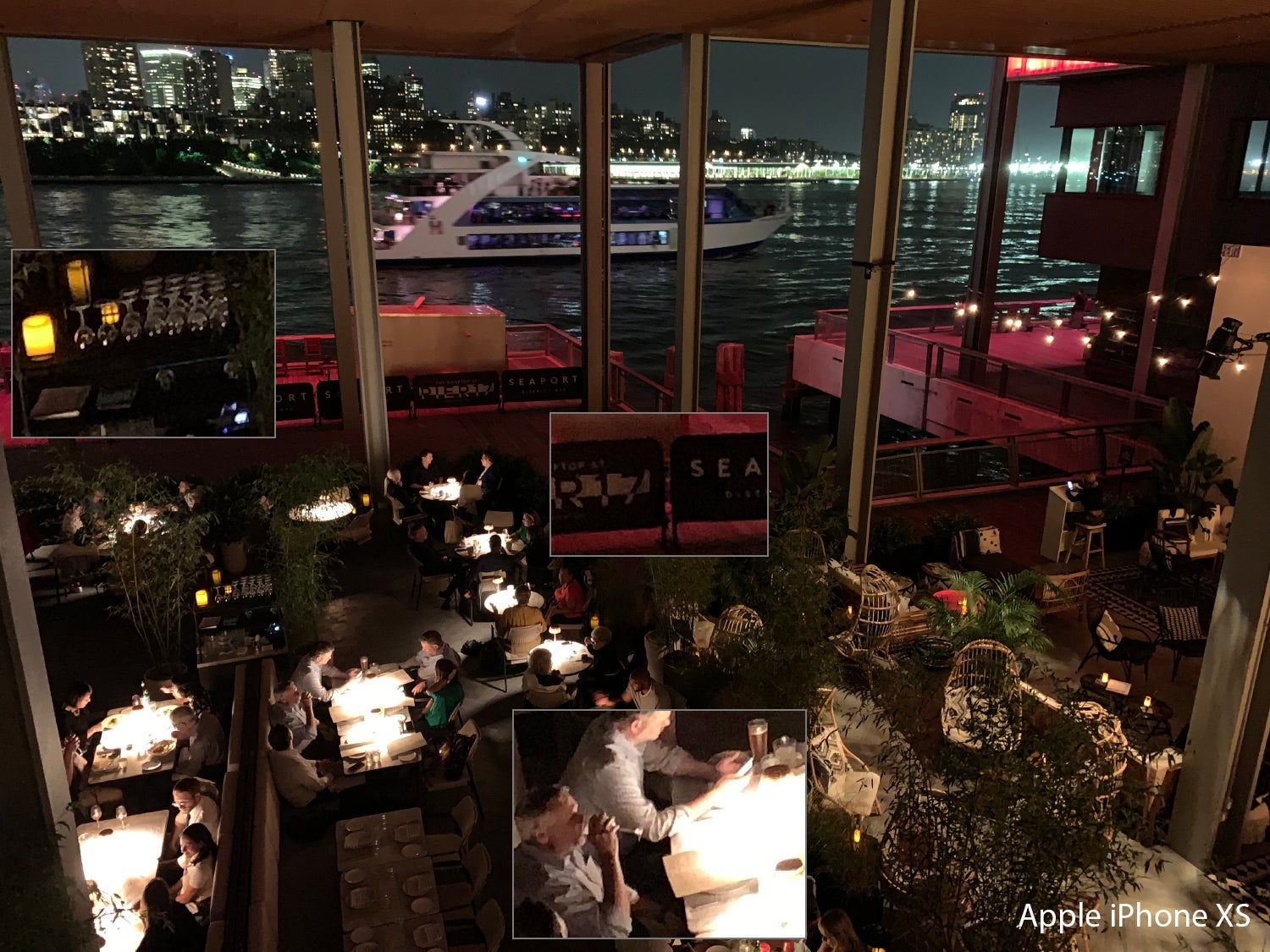 With this first scene, in a private dining room at The Fulton in New York City, I was most impressed with the iPhone 11 — details are incredibly sharp both inside the very dim room and out, with balanced exposure and colors.