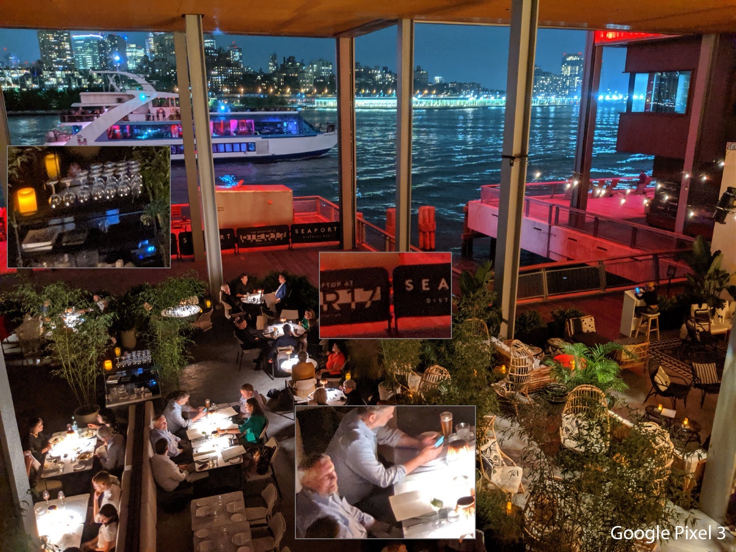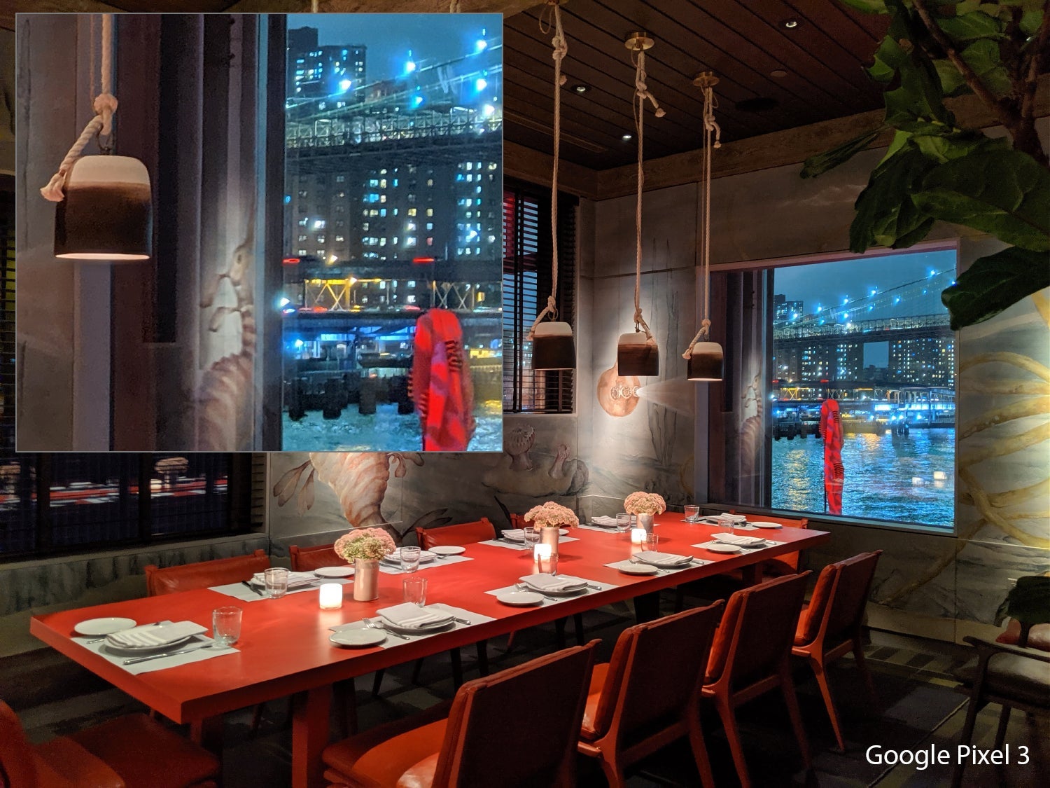 With this first scene, in a private dining room at The Fulton in New York City, I was most impressed with the iPhone 11 — details are incredibly sharp both inside the very dim room and out, with balanced exposure and colors.