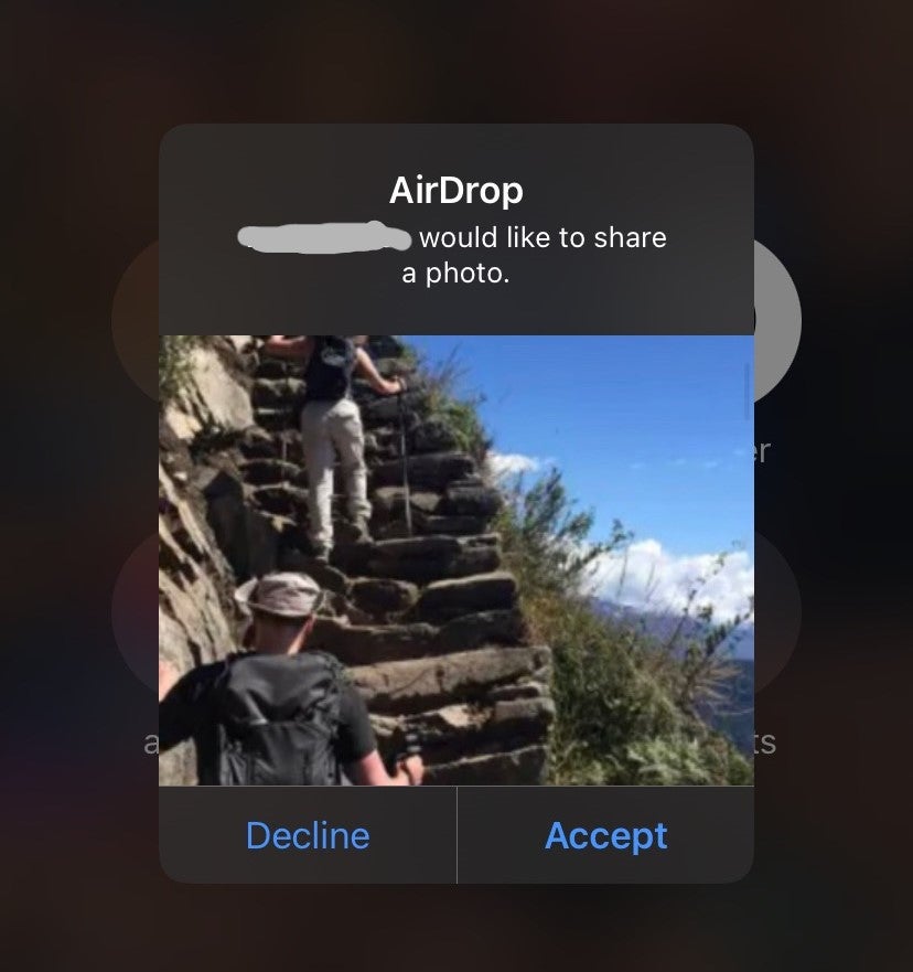 In the incidents that recently occurred on Southwest Airlines flights, passengers within the senders' Bluetooth range received explicit photos via AirDrop. The photos appeared as a preview similar to the screenshot above with a message asking to accept or decline the photos.