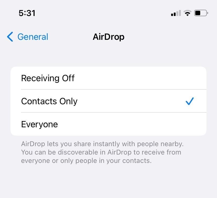 Should you want to connect to Bluetooth devices as you travel, there's another way you can protect your iPhone against unwanted photos. Begin by going to your iPhone's settings page, clicking on "General" and tapping the button for AirDrop. Once in your device's AirDrop menu, choose the "Contacts Only" or "Receiving Off" setting to limit what photos you're able to receive.
