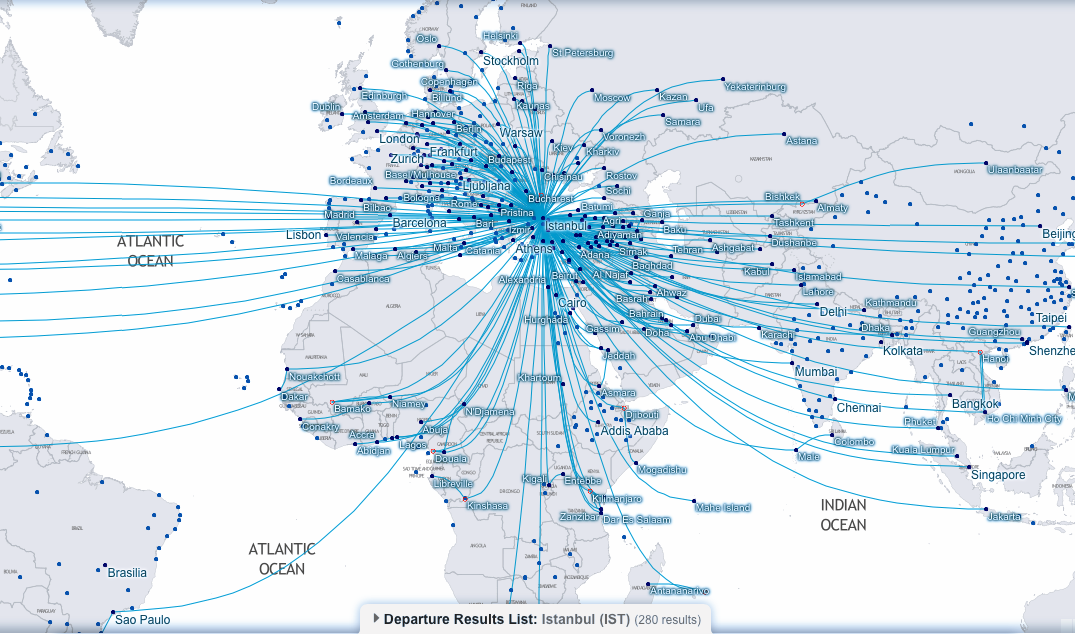 Istanbul is a major international hub and a key city for Turkish Airlines, the national flag carrier of Turkey and a member of the Star Alliance. The airline serves over 250 destinations from Istanbul, including nonstop flights to nine cities in the US: Boston (BOS), New York (JFK), Washington, DC (IAD), Atlanta (ATL), Miami (MIA), Chicago (ORD), Houston (IAH), San Francisco (SFO) and Los Angeles (LAX).