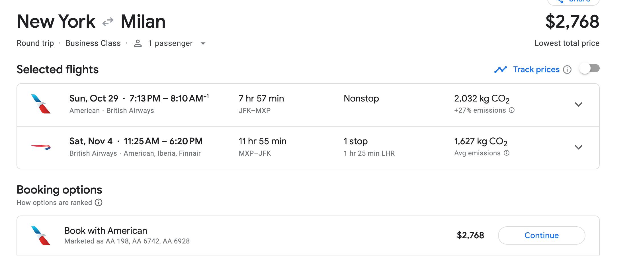 To get the $2,768 price, you'll get to fly nonstop to Milan, but you'll have a quick layover at London's Heathrow Airport (LHR) on the way home. There are other nonstop return flights, but the prices are higher.