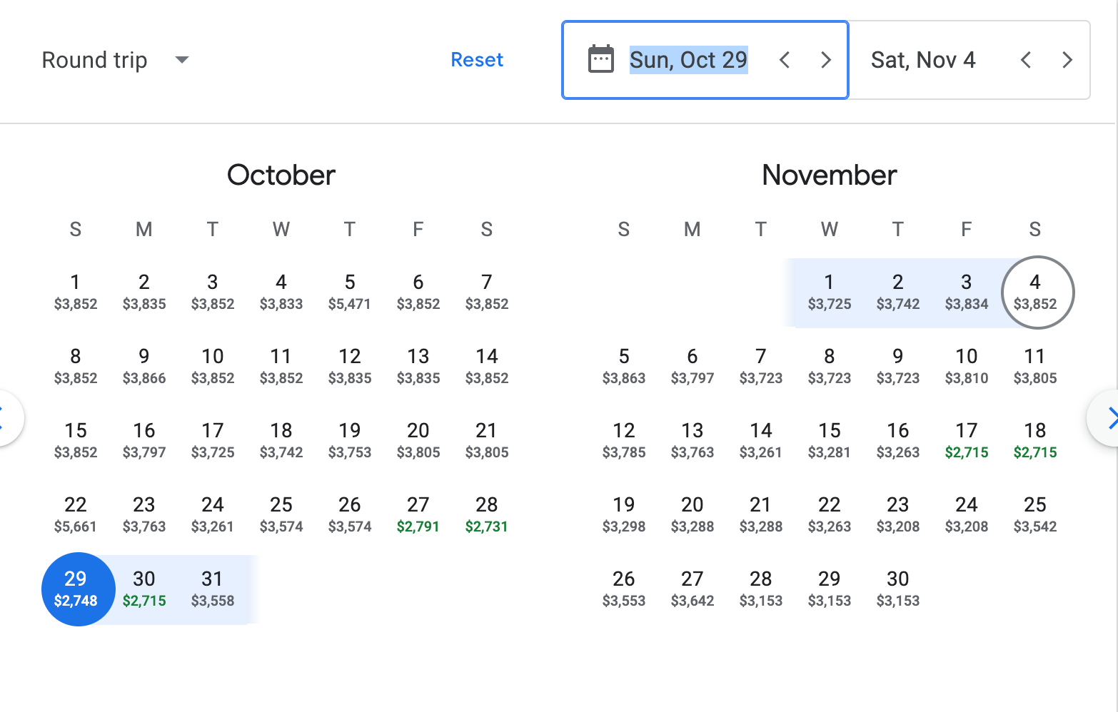 You'll notice many dates throughout the fall are more expensive, but there are deals scattered throughout.