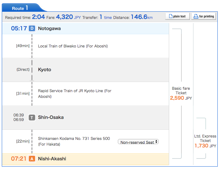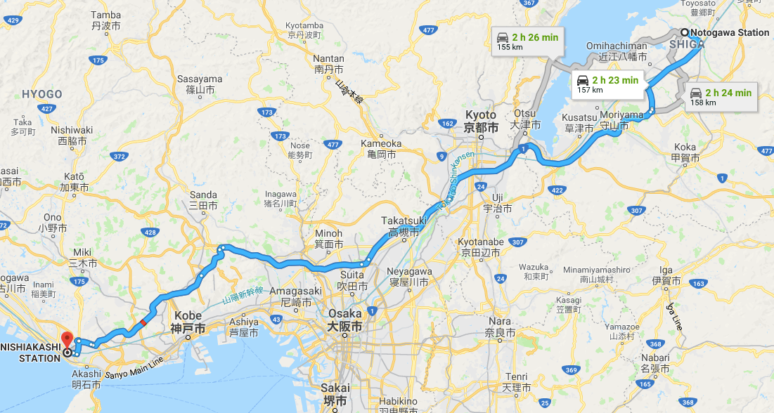 The train route originates in the Shiga Prefecture centrally located on Japan's main island, and winds past the cities of Kyoto, Kobe and Osaka on its terminus along the coast.