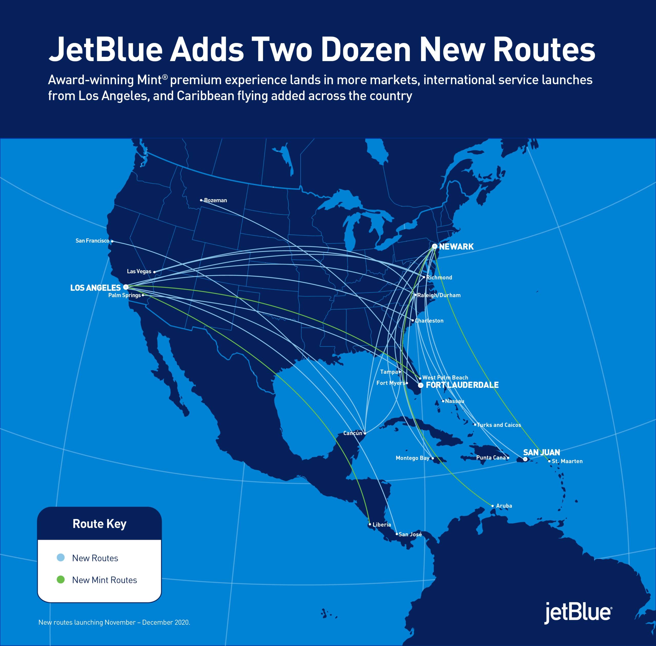 Below is a list of JetBlue's 24 new routes that begin in November and December. Most operate at least daily.