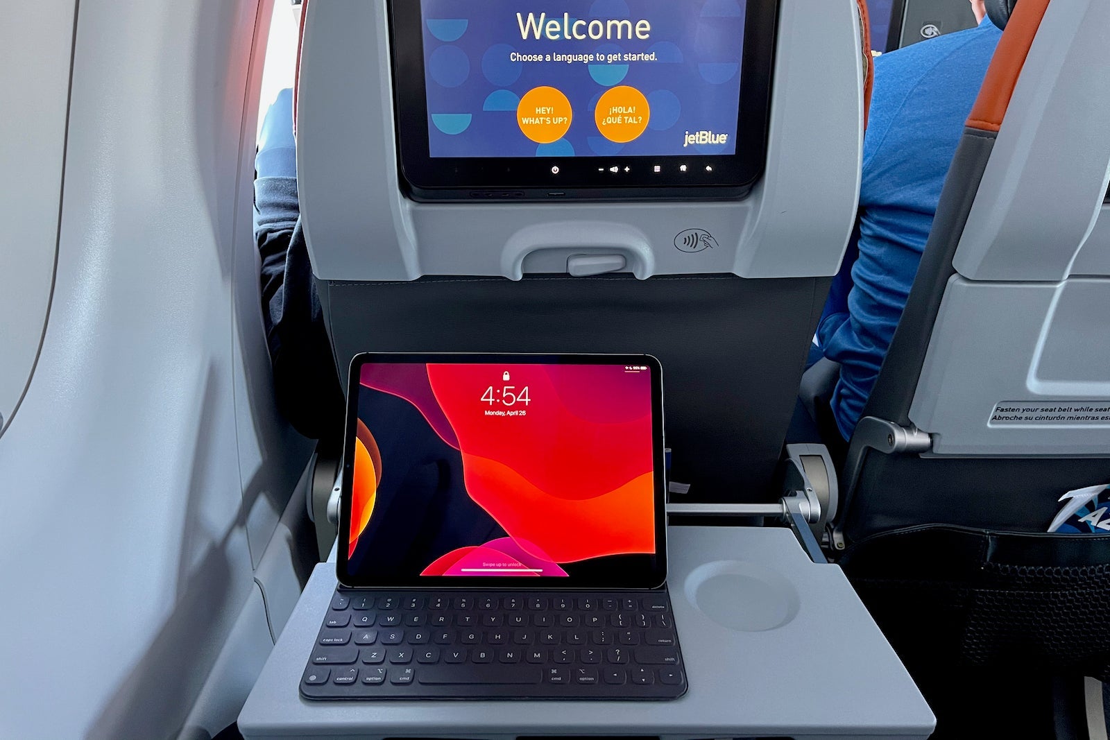 Tray tables measured 16.5 inches wide and 8.5 inches long, just the right size for an 11-inch iPad, but a tad bit too small for a 13-inch MacBook Pro.