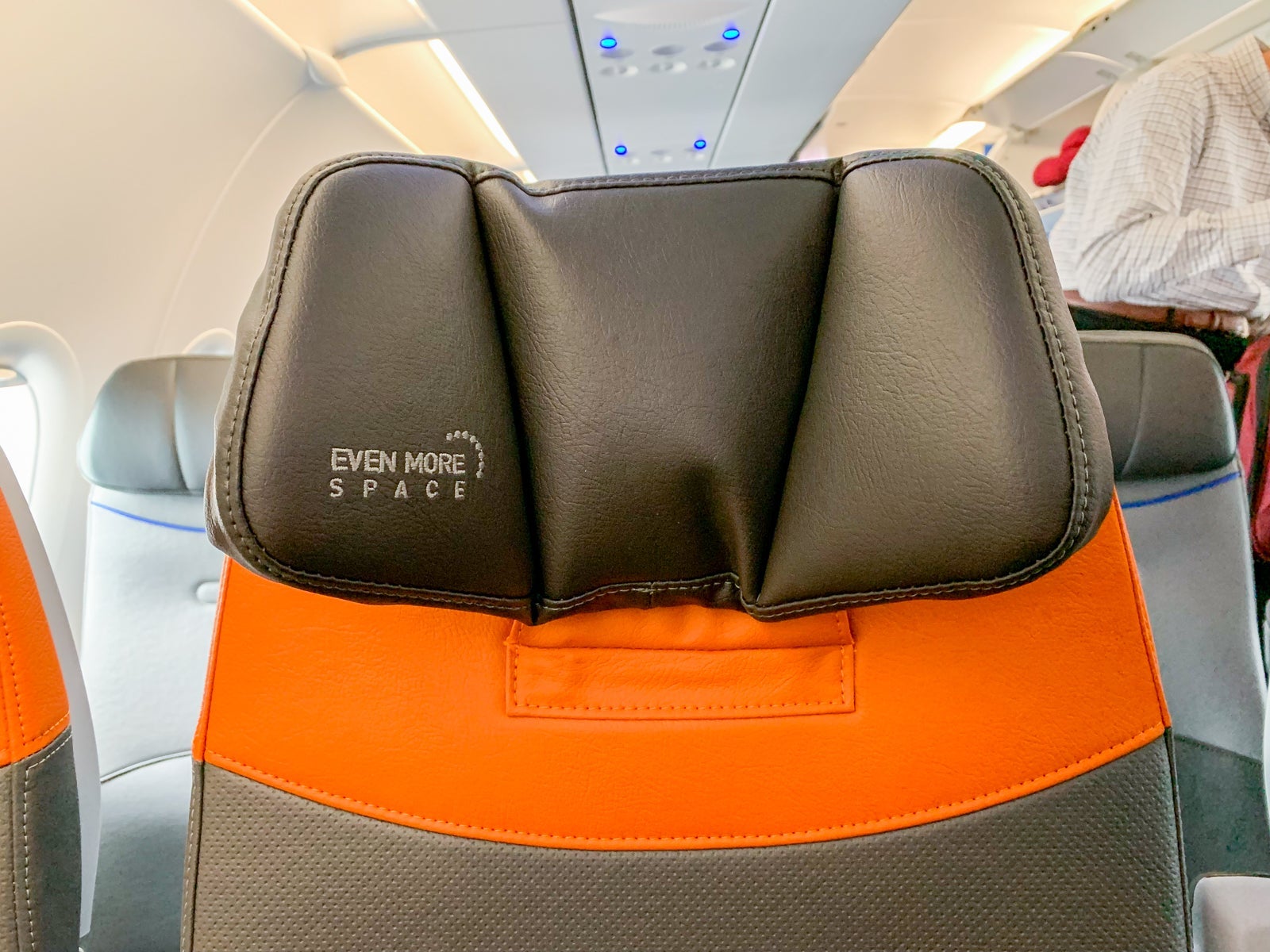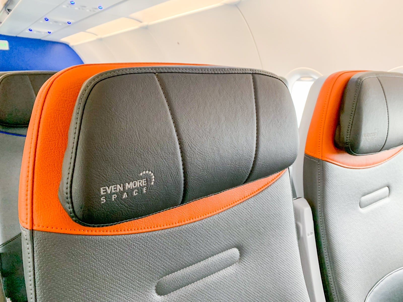 Of the plane's 34 rows, Rows 1-4 and 16-18 are dedicated to Even More Space. Core seats can be identified by a blue border, while Even More Space seats can be easily identified by the orange border.