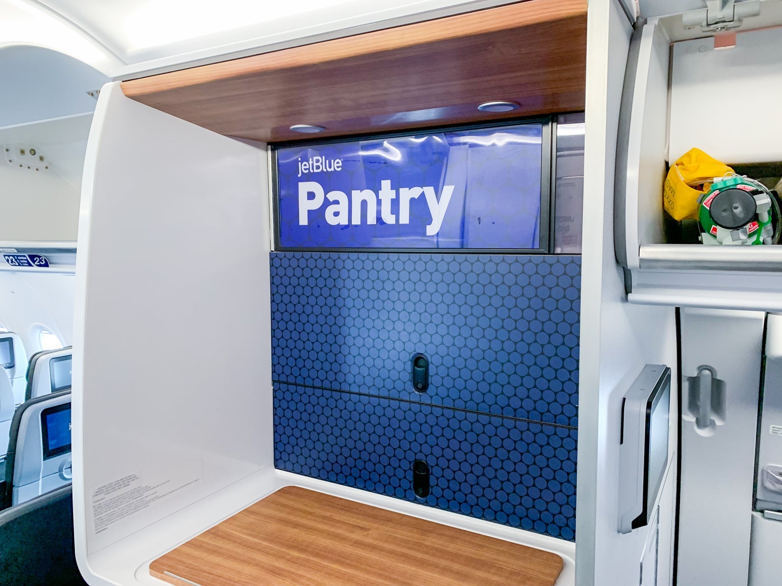 Between the two cabins is a small galley, featuring a pantry and lavatory. The pantry is reminiscent of the carrier's Mint-equipped A321s, though this one doesn't have as much storage space (and doesn't offer as varied a beverage selection.)