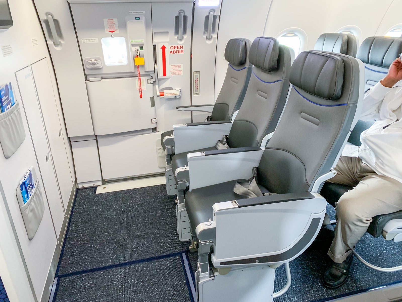 The Collins Aerospace Meridian seats are the same as those being installed as part of the carrier's "Phase 2" retrofit program for the A320s. The seats are slimline and feature an above-average 18.7 inches at their widest. The armrests are quite narrow, but they all move up and down (except for those adjacent to the window).