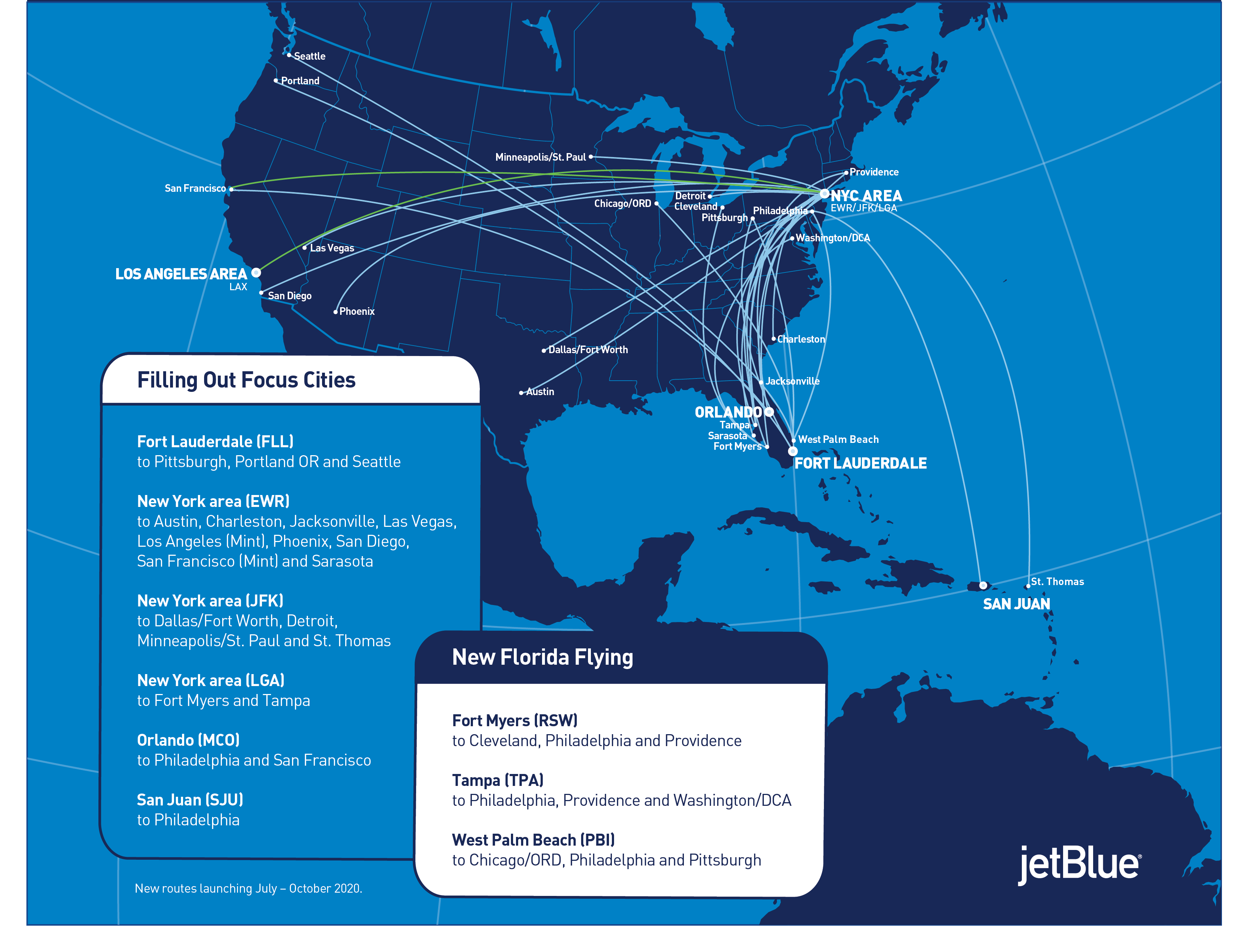 The new routes at the New York-based carrier will come from its focus cities and Florida between July and October, JetBlue said Thursday. The airline hopes the routes will help it generate revenue, reactivate aircraft and avoid staff furloughs this fall.