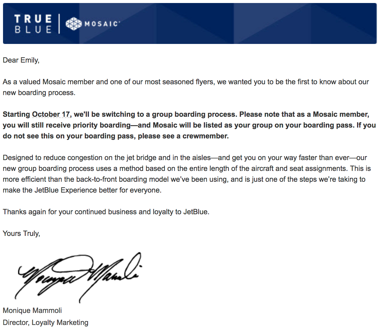JetBlue let Mosaic members know about the new process first in an email sent by the Director of Loyalty Marketing, Monique Mammoli: