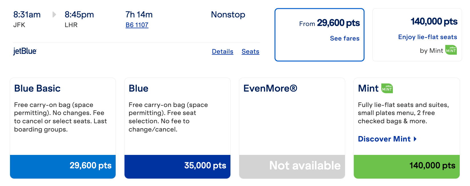 For instance, you could fly nonstop from New York to London for under 30,000 points each way in Blue Basic or in JetBlue's business-class Mint cabin for 140,000 points one-way (plus taxes and fees).