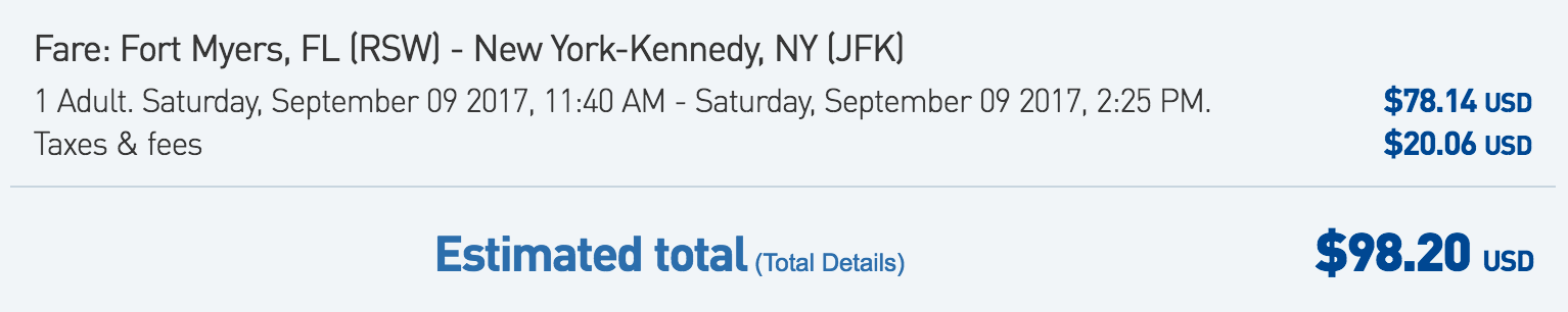 A quick search shows that there are still some flights available — showing at the promised rate. For example, this flight from Fort Myers (RSW) to New York (JFK) on Saturday, September 9 will run you just $98 — or 9,400 TrueBlue points + $5.60.
