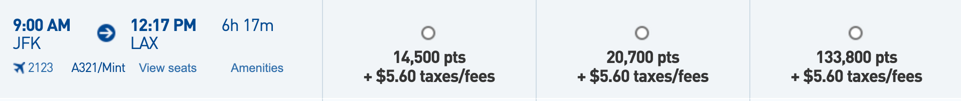Here's an example of how this works. Let's say that you wanted to fly from New York-JFK to Los Angeles (LAX) on Friday Nov. 6, and you were looking at Flight 2123, departing at 9 a.m. Here are the three award prices: