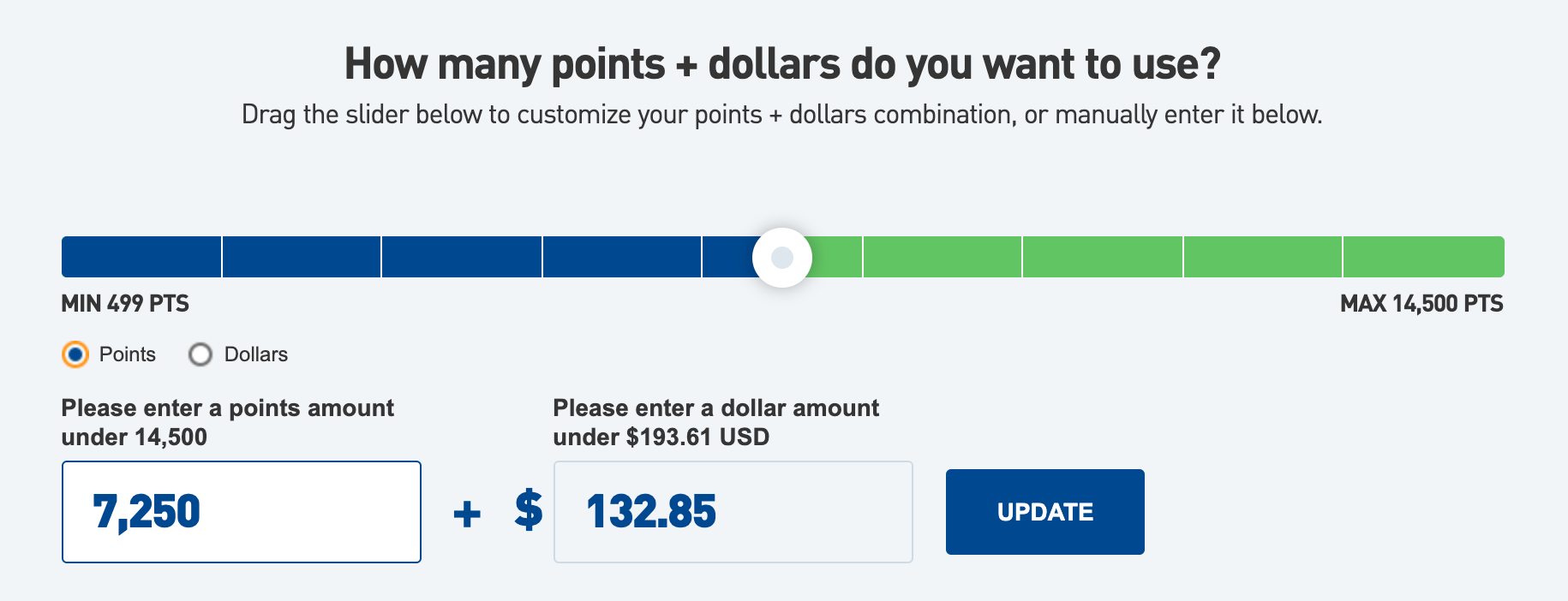 With a paid fare of $198.10, that means your 7,250 points are covering just $65.25 worth of the ticket — or a redemption value of just 0.9 cents per point. And it appears that this value is fixed. Using the slider to adjust the points you're using results in that same redemption value.