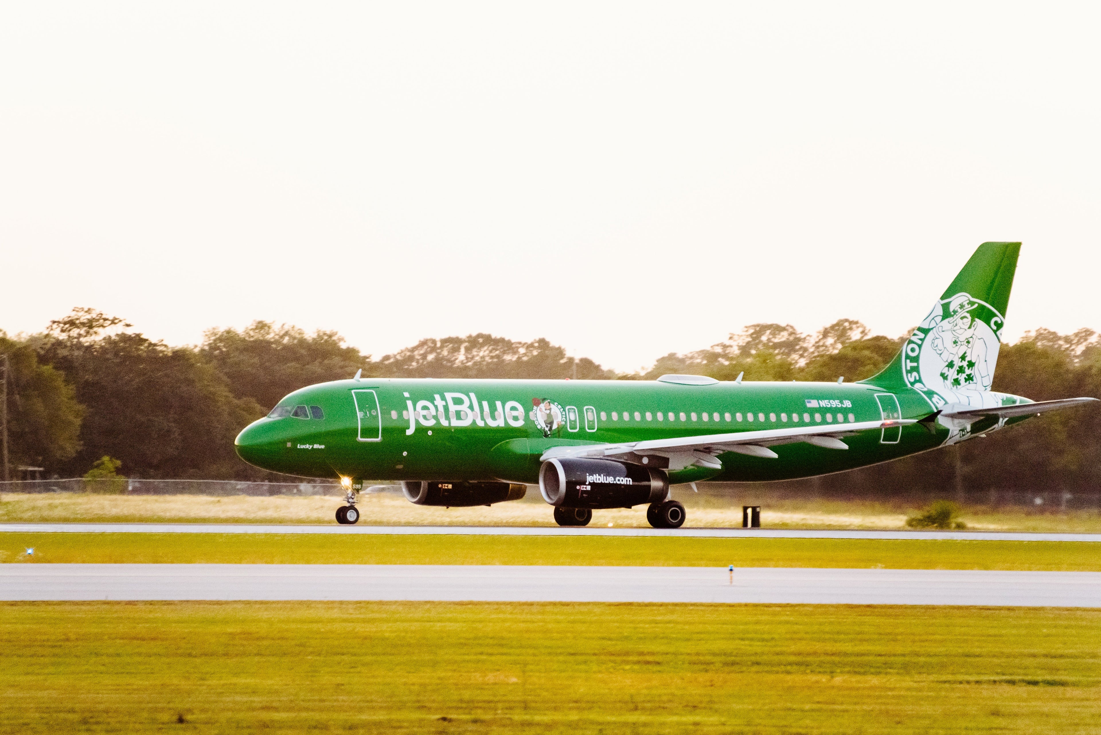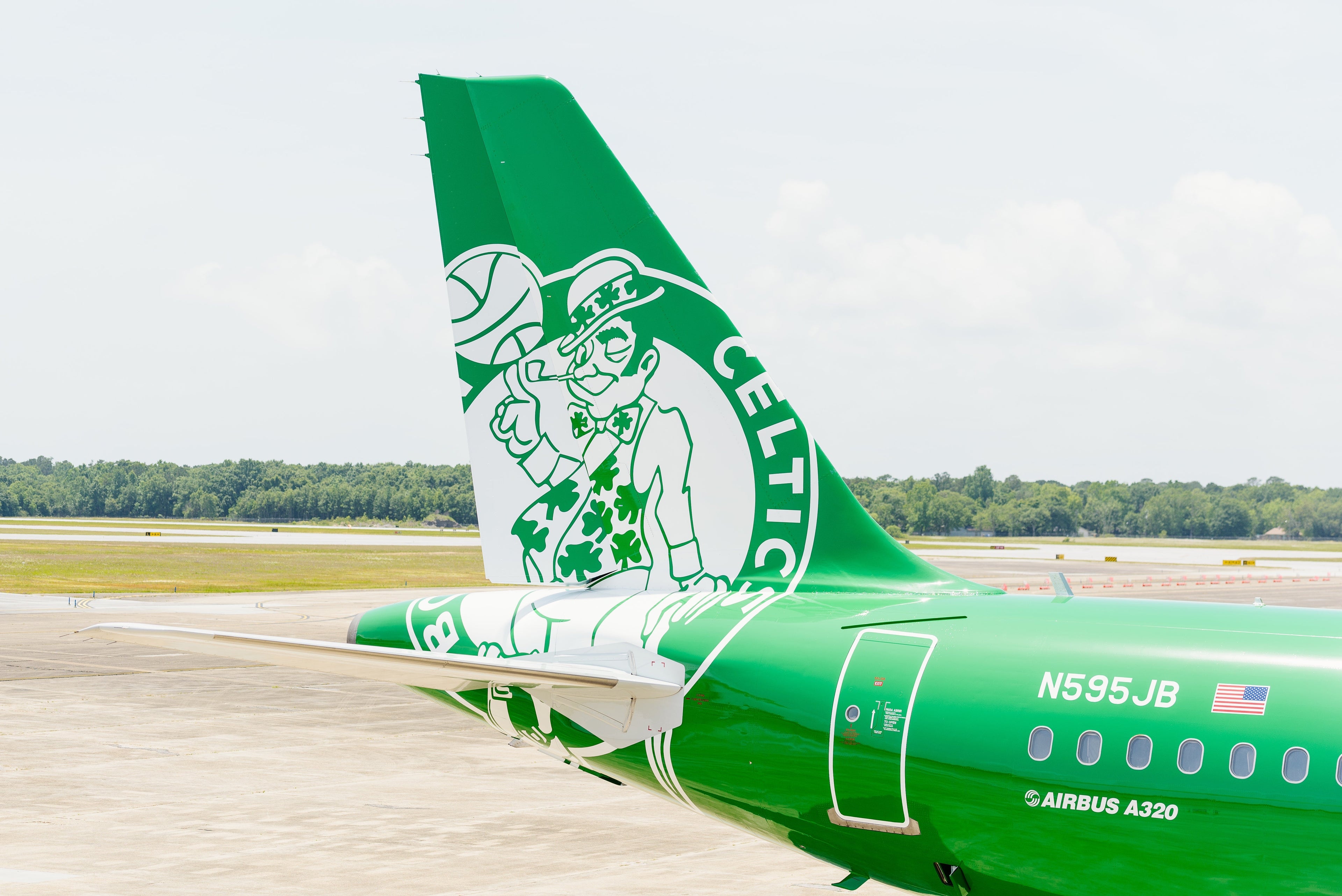 The bright green aircraft signifies JetBlue's first-ever co-branded livery for an NBA team. The A320 — registration N595JB — was officially unveiled on Monday at Boston Logan International Airport (BOS), where both JetBlue and Celtics executives were in attendance.