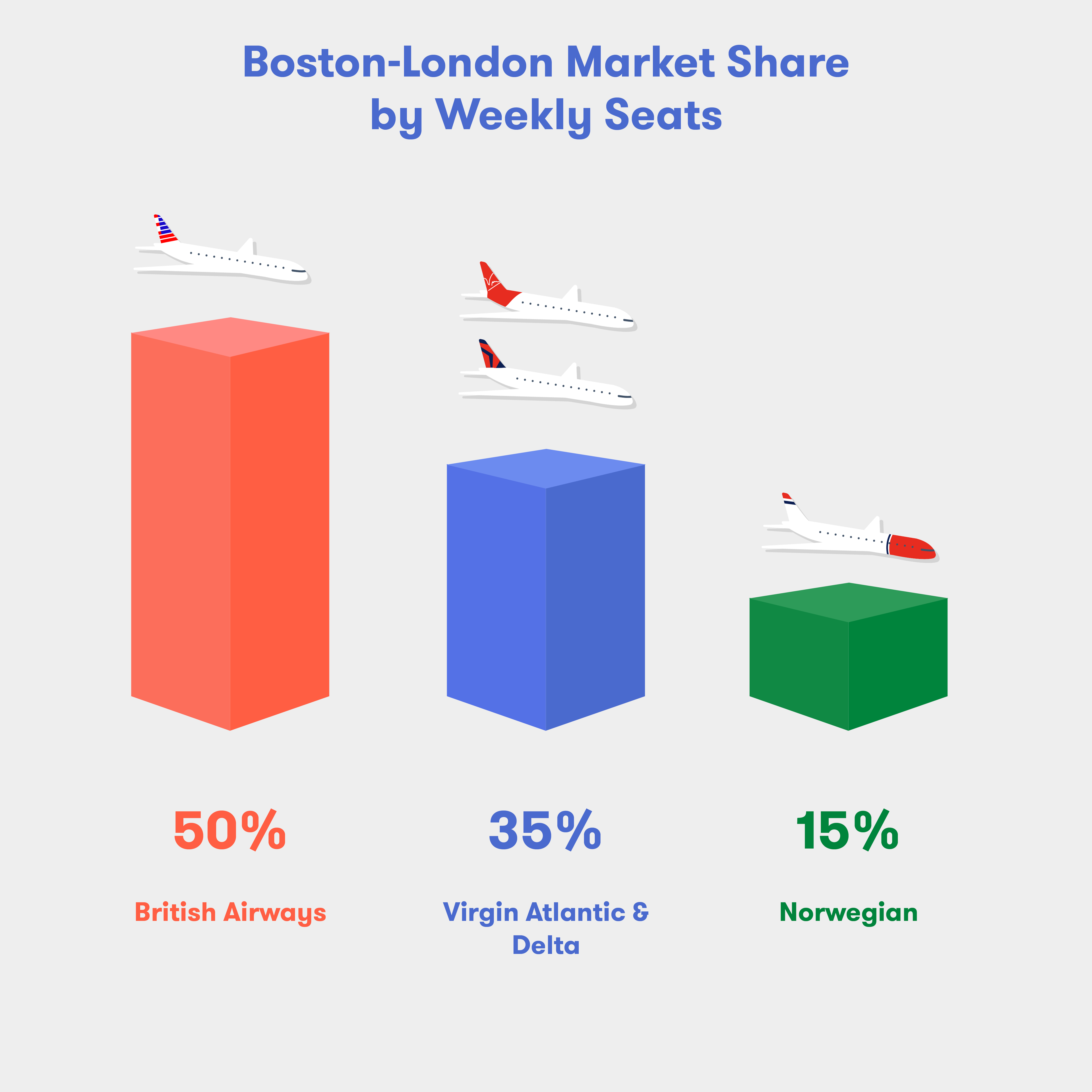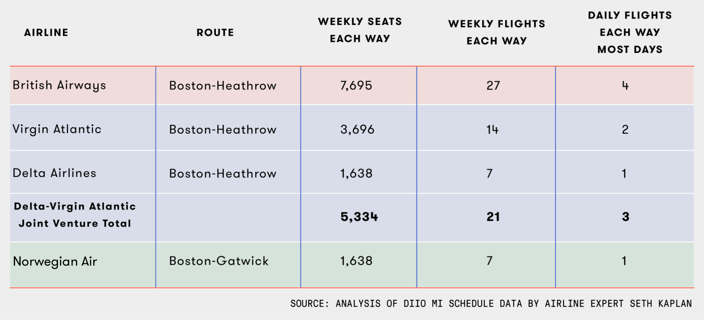 The Oneworld alliance also controls half of the 15,000 weekly seats between Boston and London.