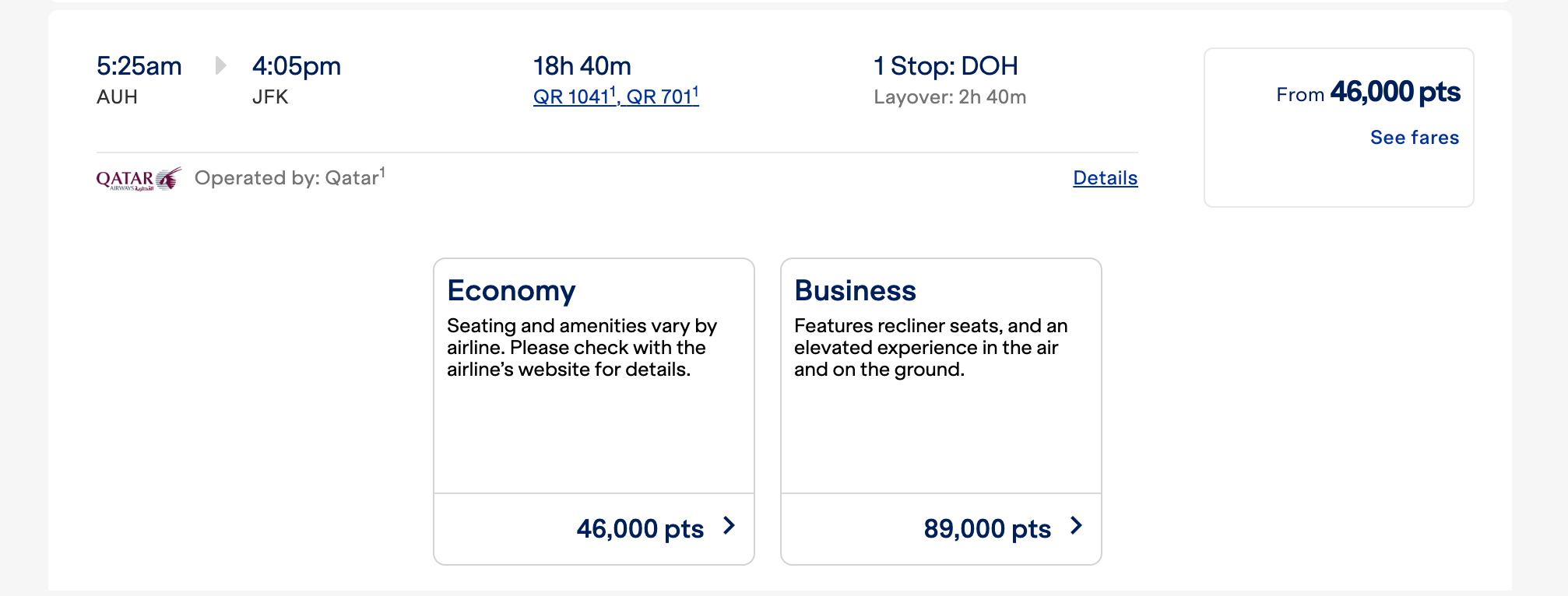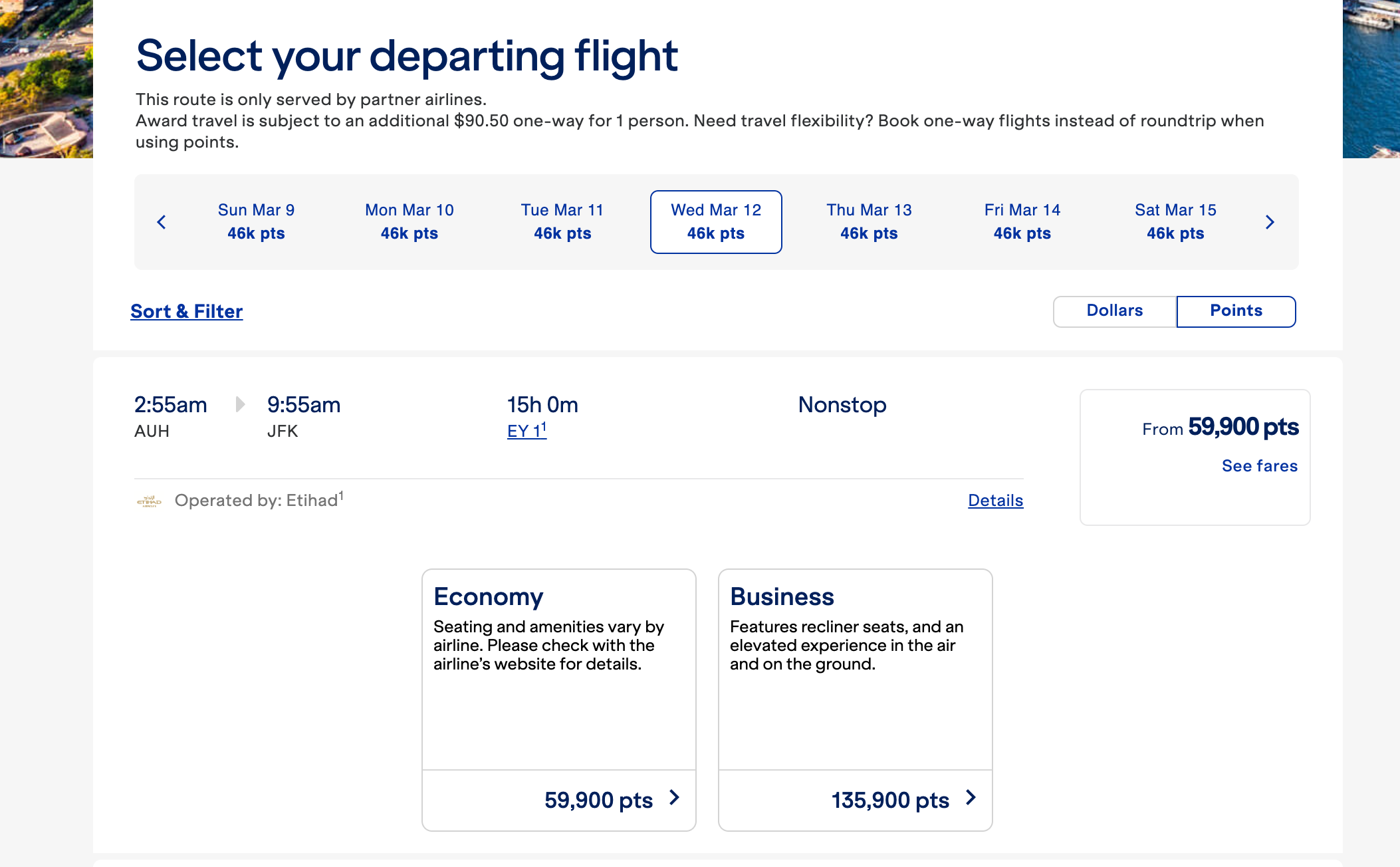 Note that this is significantly higher than the price TrueBlue charges for flights operated by Qatar Airways between the same city routes. In those cases, you will need just 46,000 points for economy or 89,000 points for business class. Because of this, you should only consider booking on Etihad when Qatar Airways flights are unavailable.