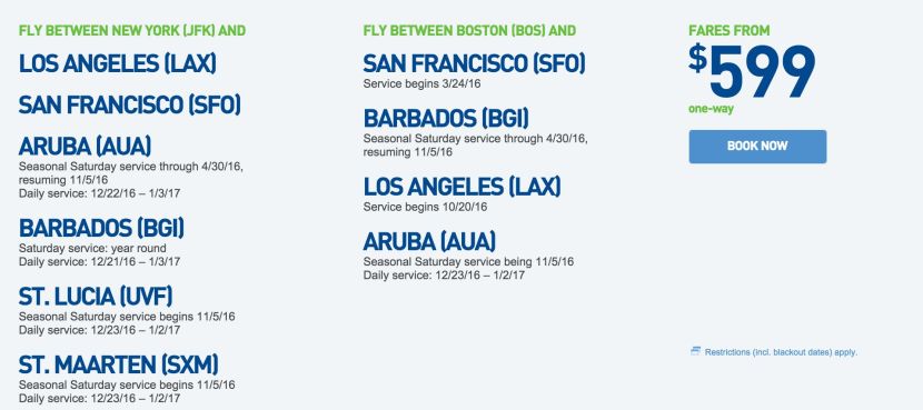 The added routes from New York to St. Lucia and St. Maarten will begin on November 5. Boston's new Mint route to Aruba will begin on the same date, in addition to its new Mint route to Los Angeles, which is set to begin on October 20. All of the new routes will be available to book starting Sunday, April 3.