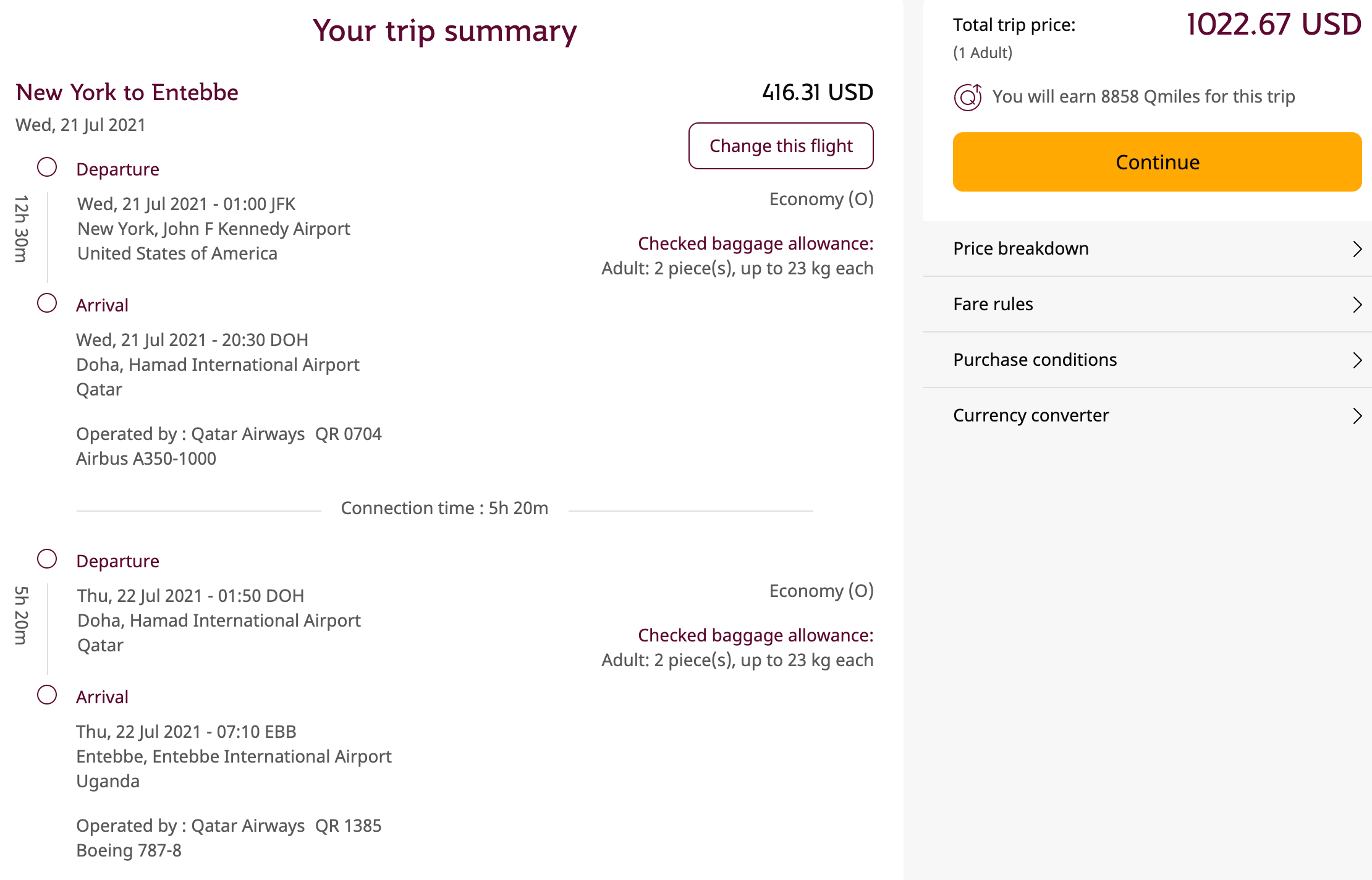 Be sure to compare pricing when booked directly with Qatar Airways as well — in some cases, you may save a considerable amount when booking through one carrier over the other, as you can see with the identical Qatar booking below: