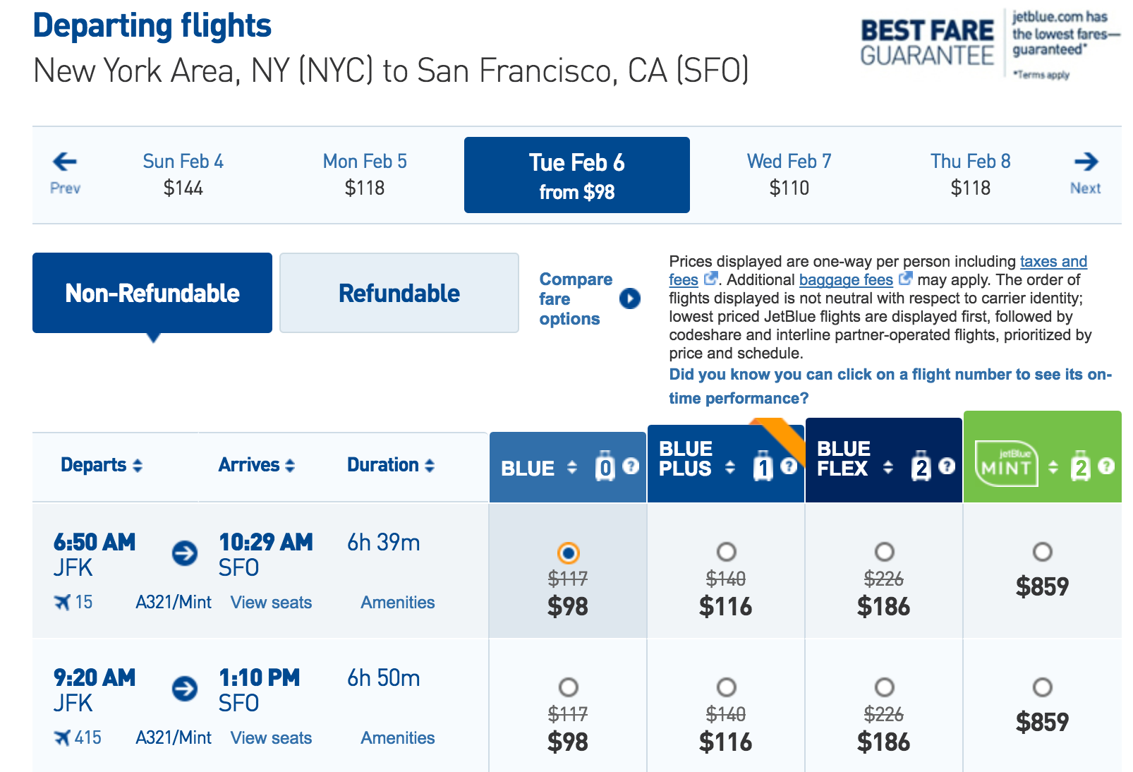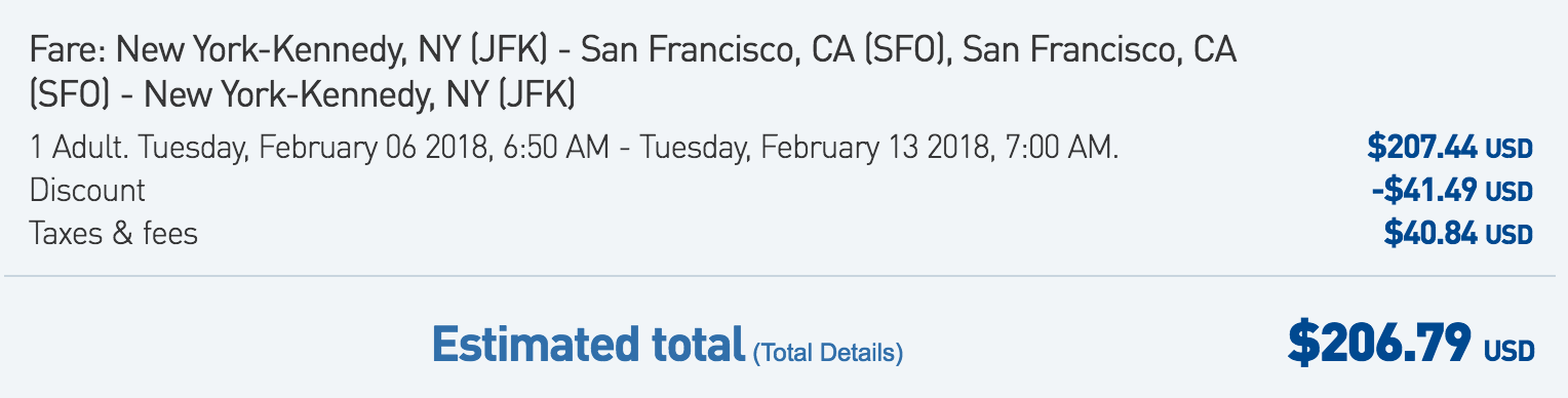 The good news is that this discount is available for both one-way and round-trip itineraries, so your options are rather open. For example, you could fly from New York (JFK) to San Francisco (SFO) for $98 one-way: