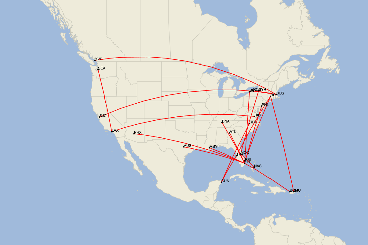 The hardest hit is the airline's Fort Lauderdale focus city, which is losing eight routes for portions of the summer. In terms of destinations, Cancun will see reduced service from Raleigh-Durham and Tampa.