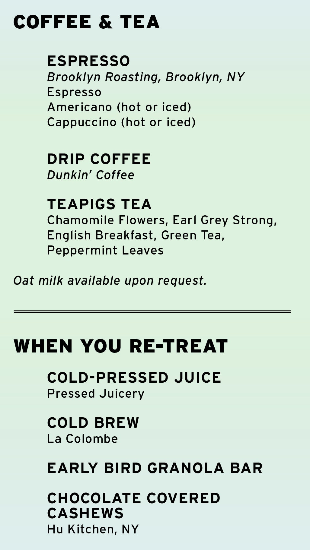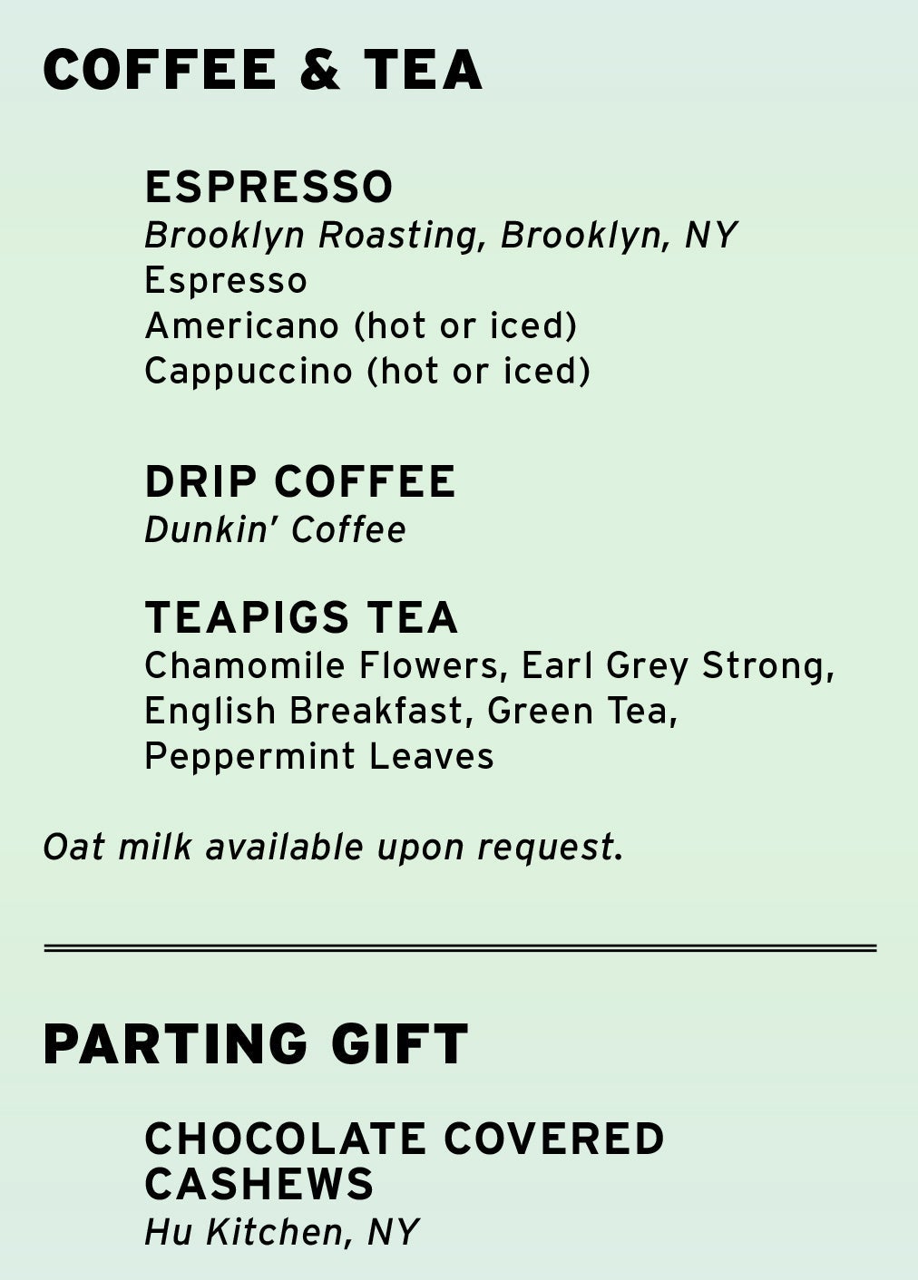 Menus will vary slightly depending on the time of day and direction of travel. For example, below is the tea and coffee list for eastbound morning flights.