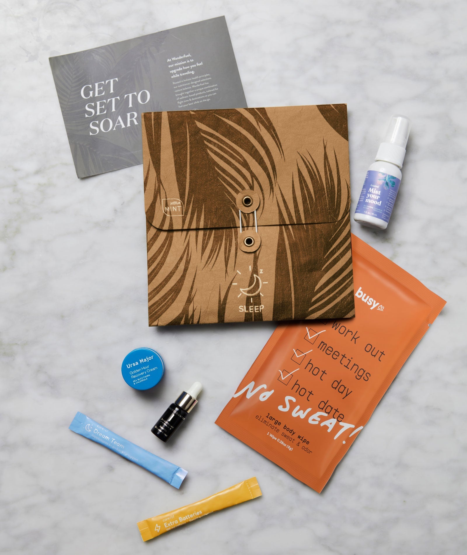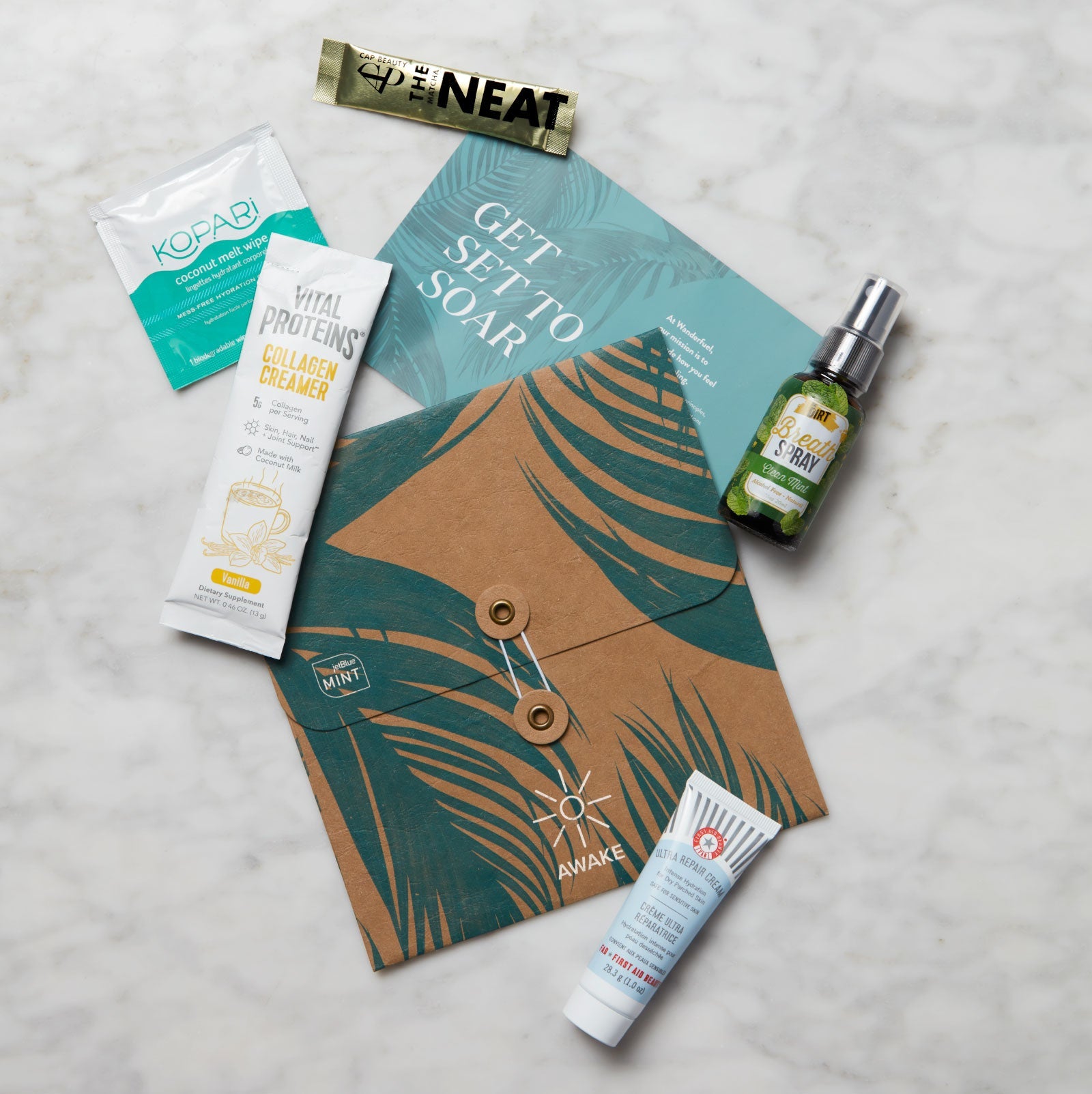 Travelers on morning flights will get the Awake kit, including items like a mint breath spray, collagen creamer and repair cream.
