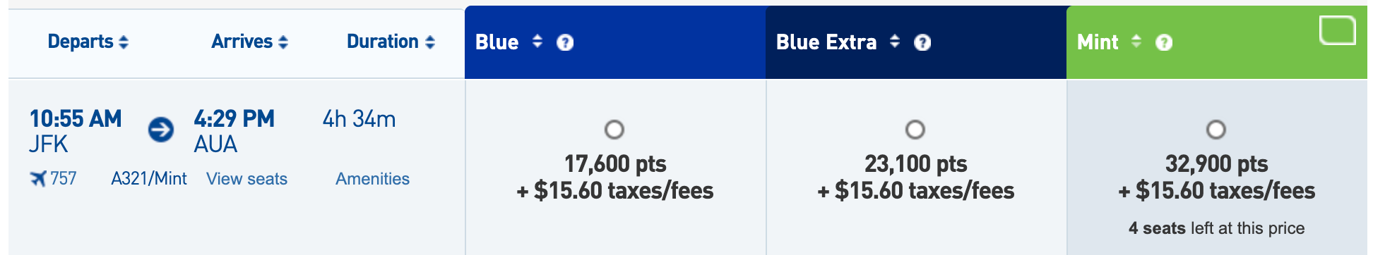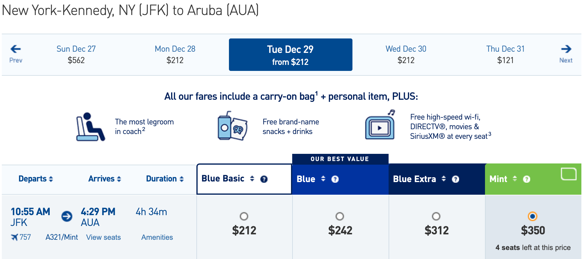 Paid fares are consistently available for around $500 each way for transcon flights, or as little as $350 each way for flights to the Caribbean. As of this writing, you can book one-way flights between New York (JFK) and Aruba (AUA) for just $349, for example.
