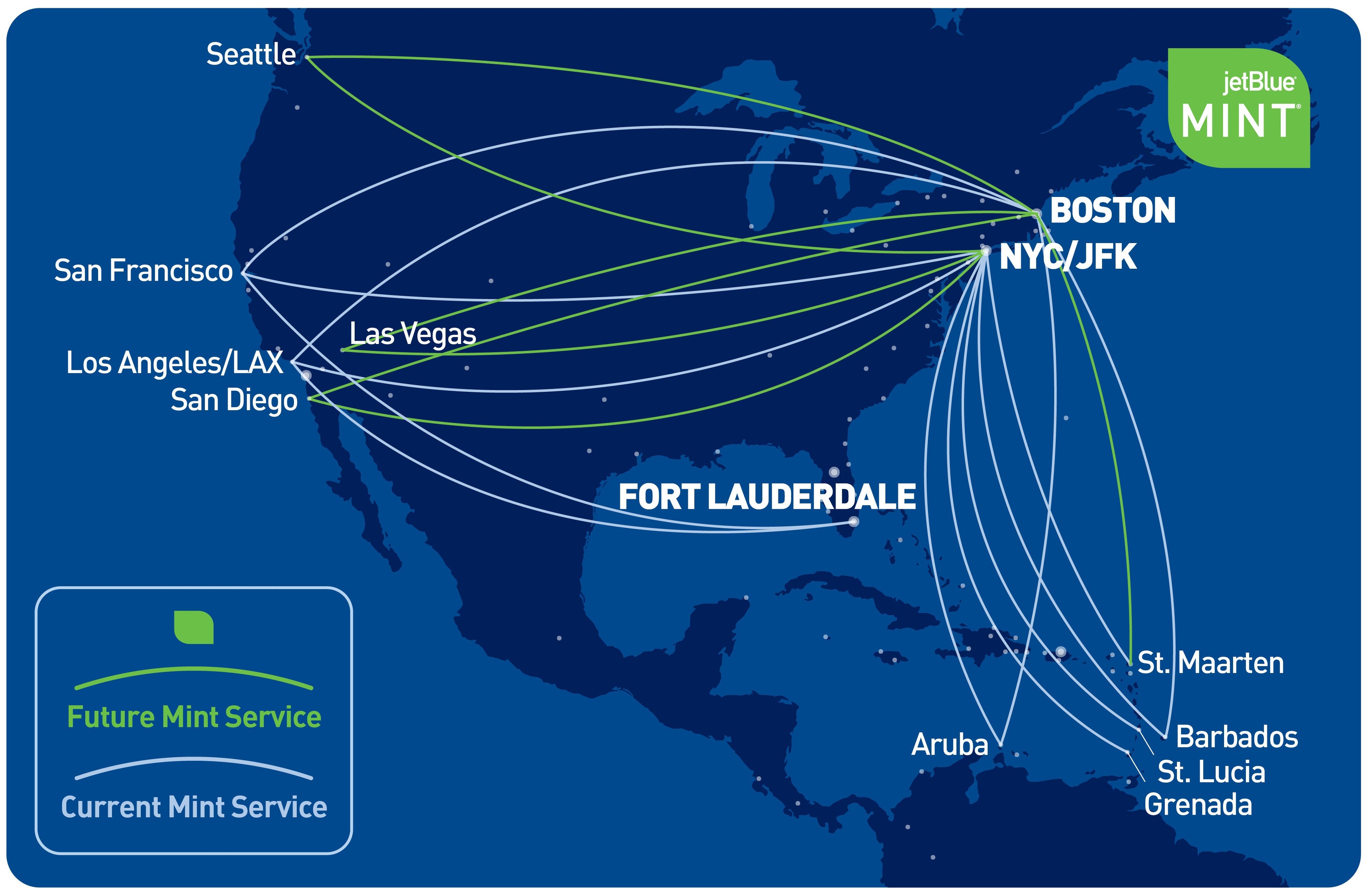 Below is JetBlue's updated Mint route map, which includes the new service launching next year: