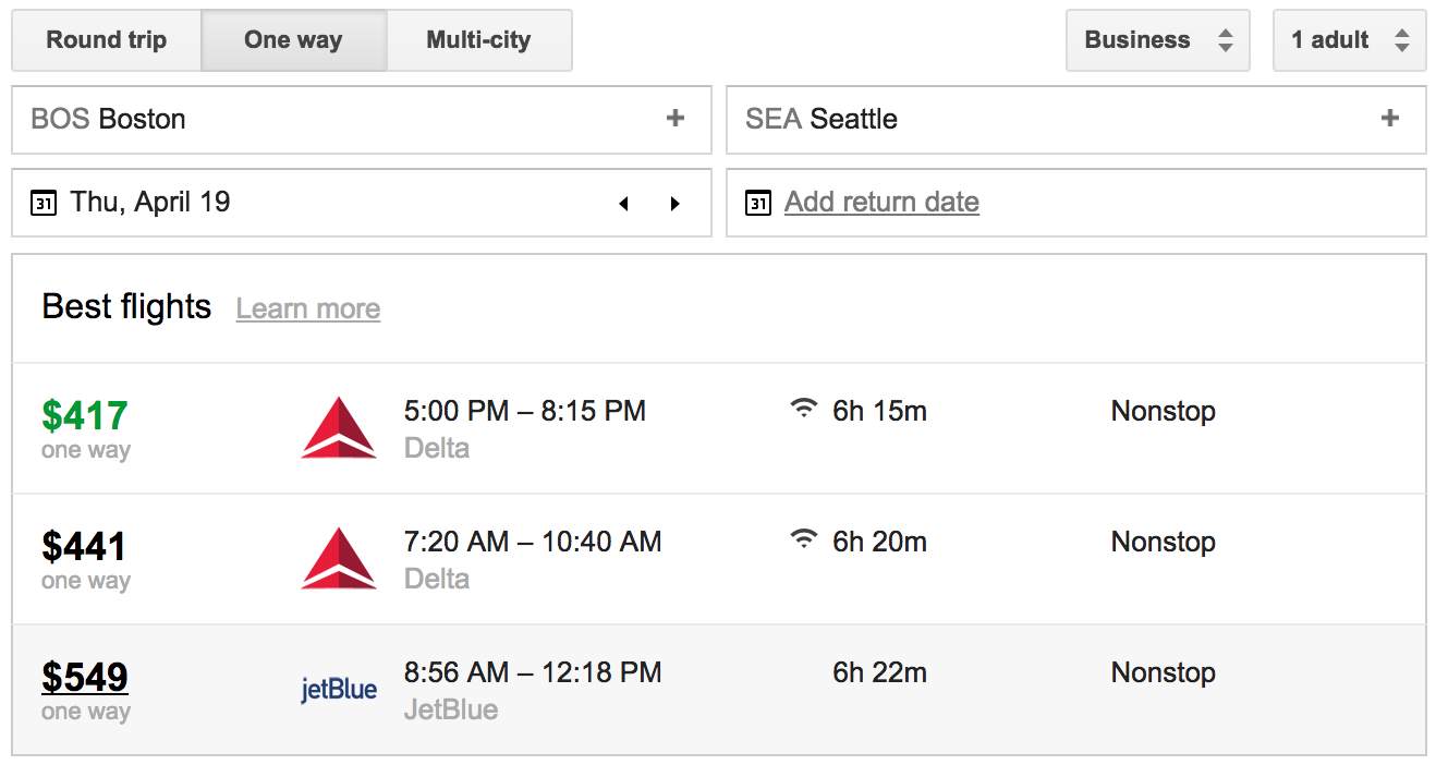 Delta, which operates 737s with recliner seats on this route, is forced to undercut JetBlue's lie-flat business-class fares, which are still quite reasonable for a one-way transcon, all things considered.