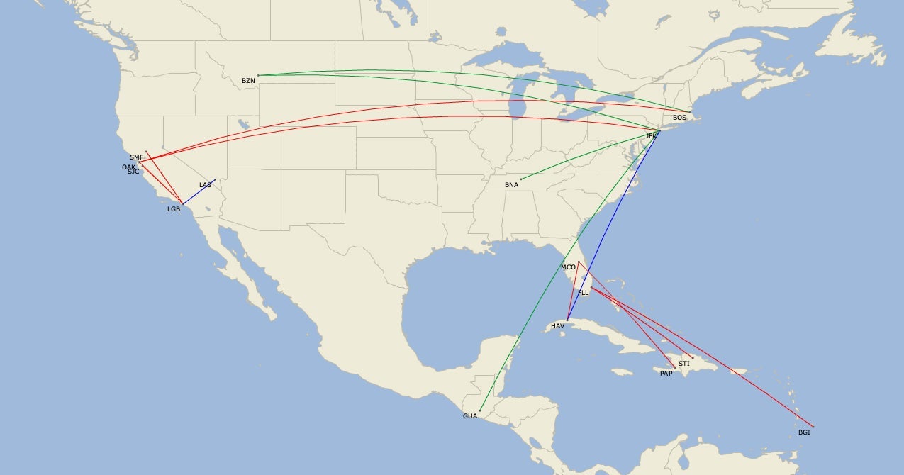 Boston and New York JFK continue to be JetBlue's focus. Both cities have seen a number of recent additions, including an expanded shuttle-like operation between Boston and both New York LaGuardia (LGA) and Washington Reagan National (DCA), and routes from JFK to Ecuador and Guyana in South America.