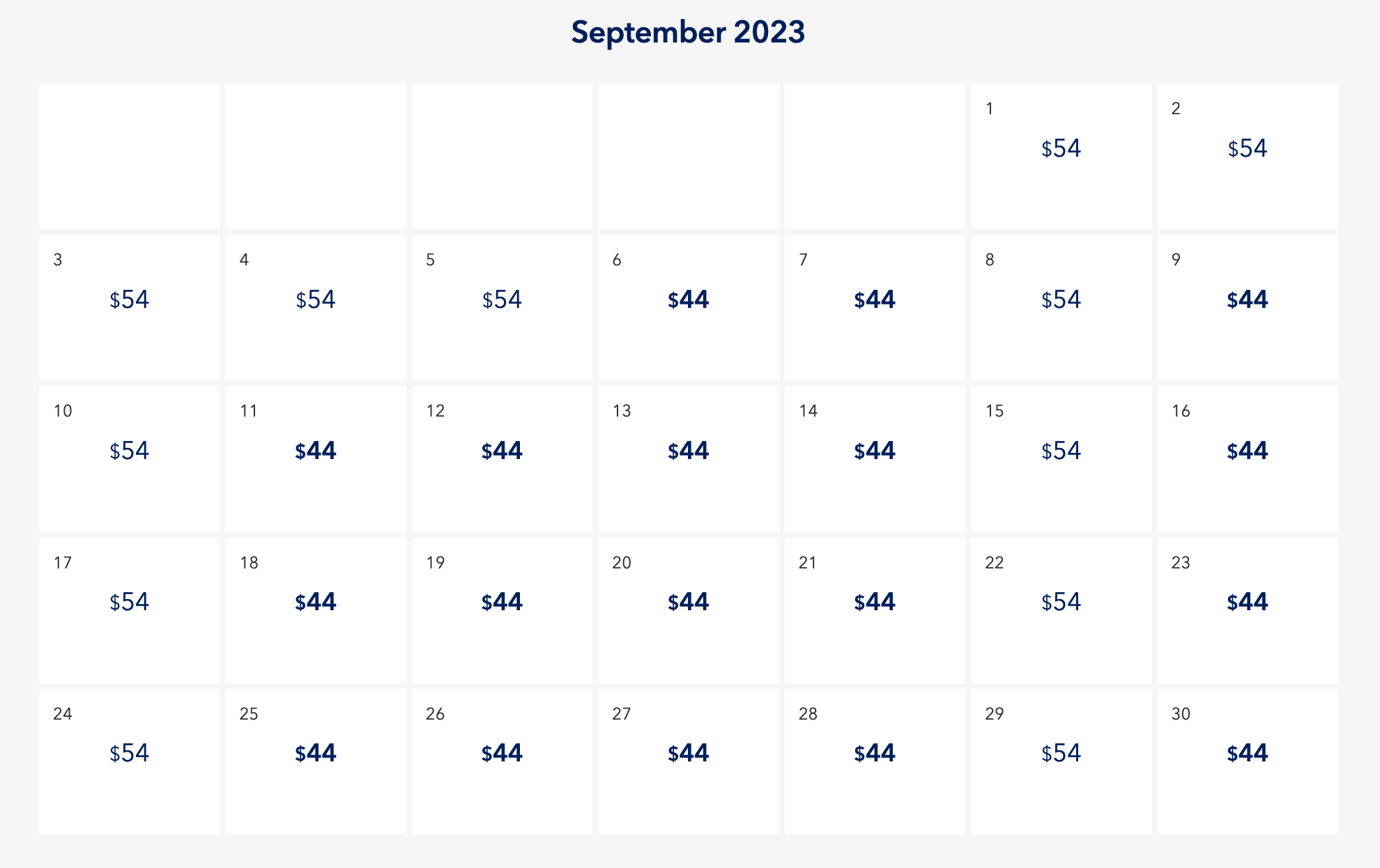 To ensure you're getting the $44 price tag, plan your trip around JetBlue's fare calendar. For the majority of travel dates during the sale period, one-way fares to Boston are priced at $44.