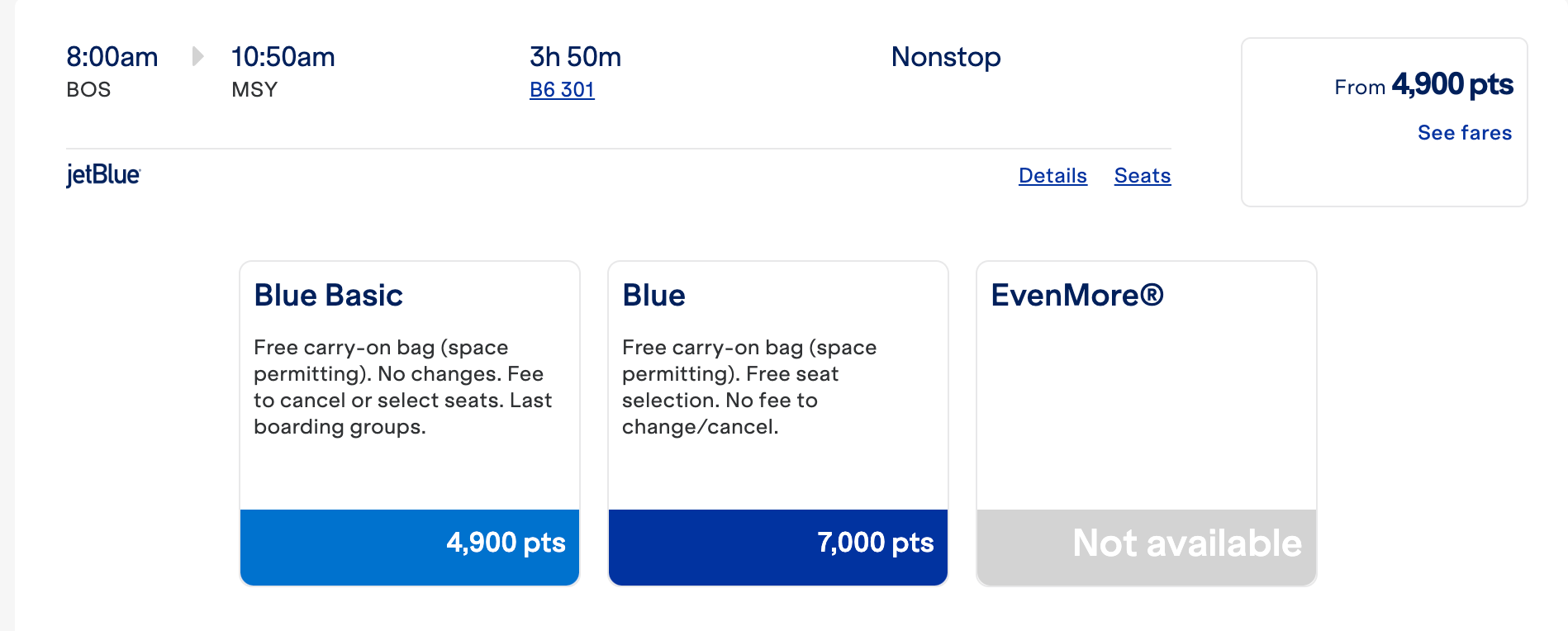For most other routes, we're seeing redemptions between popular destinations for less than 5,000 points in Blue Basic. For example, this flight from Boston Logan International Airport (BOS) to Louis Armstrong New Orleans International Airport (MSY) in April is 4,900 points.