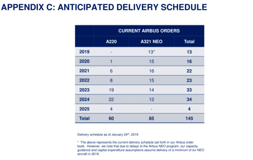 That isn't the only hold up, instead of taking 13 A321neos this year JetBlue will only get six because of delays on Airbus' end — JetBlue has orders for 85 A321neos and 60 A220s. Note that the delivery schedule chart below does not include the delays to the A321neo.