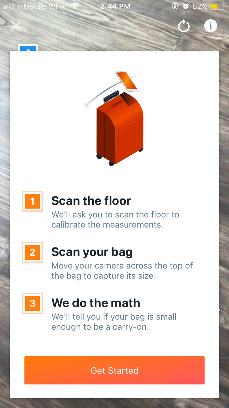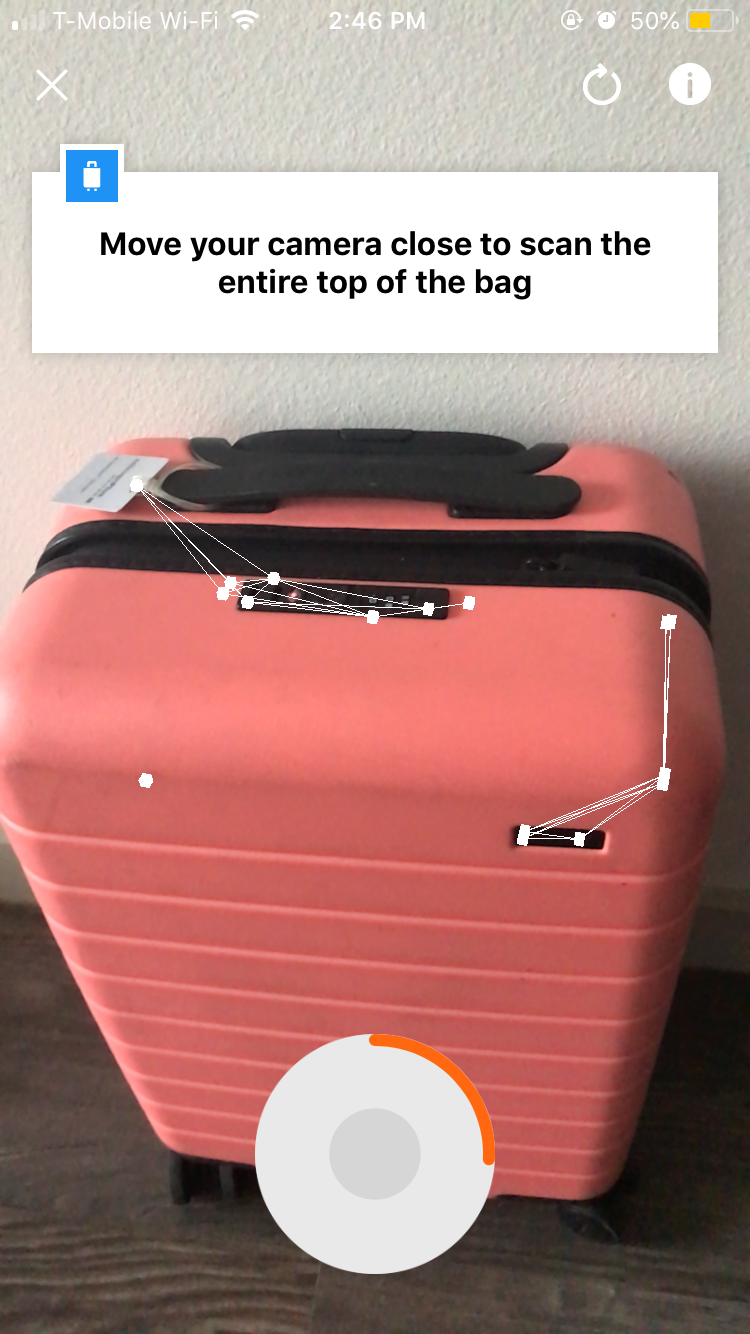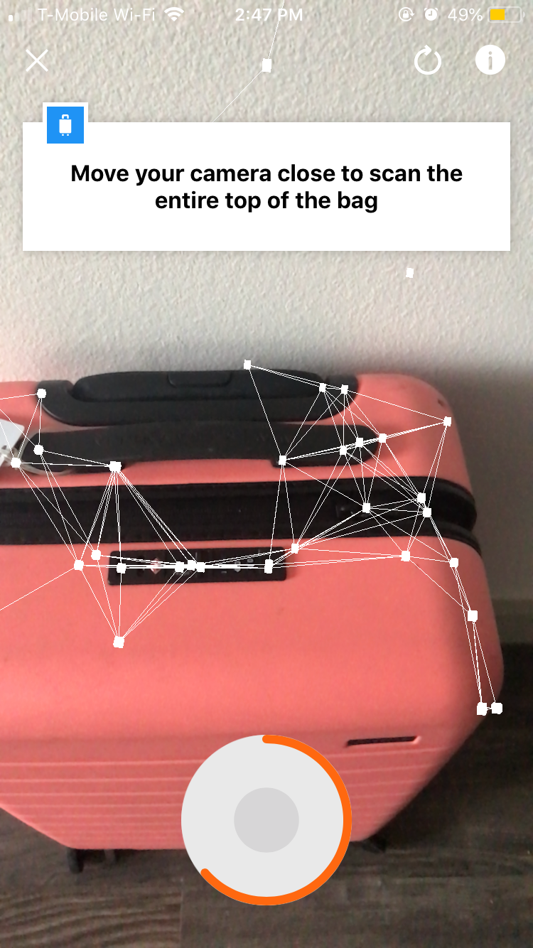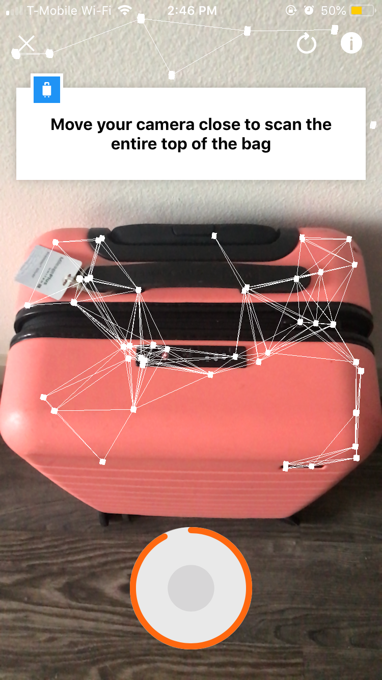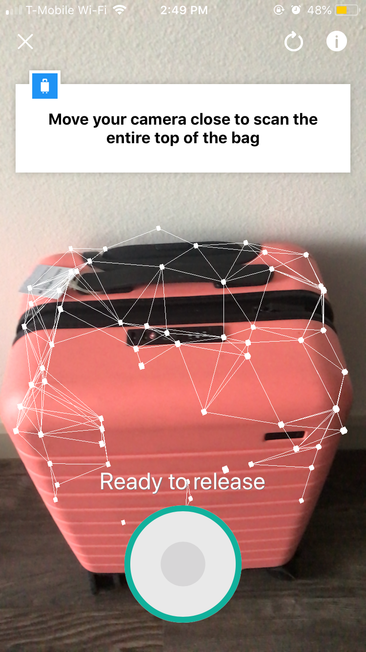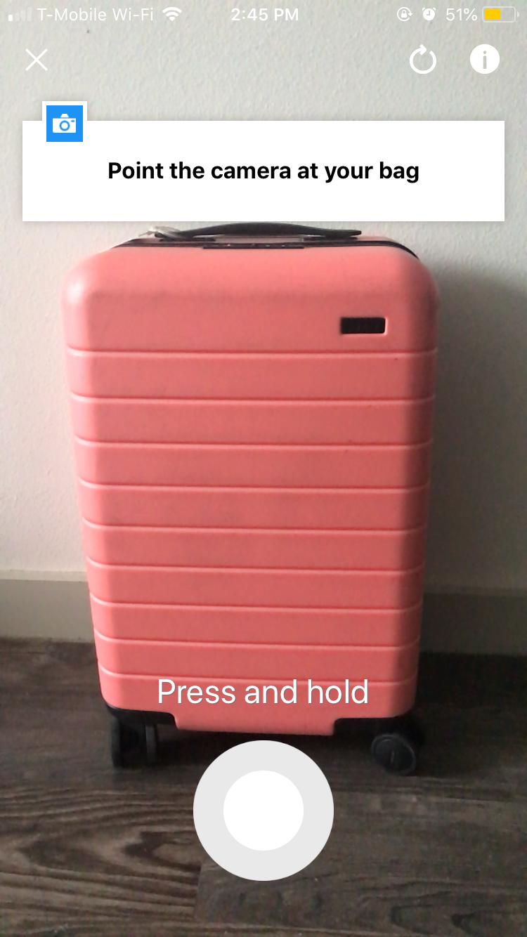 Unlike the KLM feature, which works off of a single photo, the Kayak app requires that you press and hold down on the camera button while scanning the top of the bag for size.