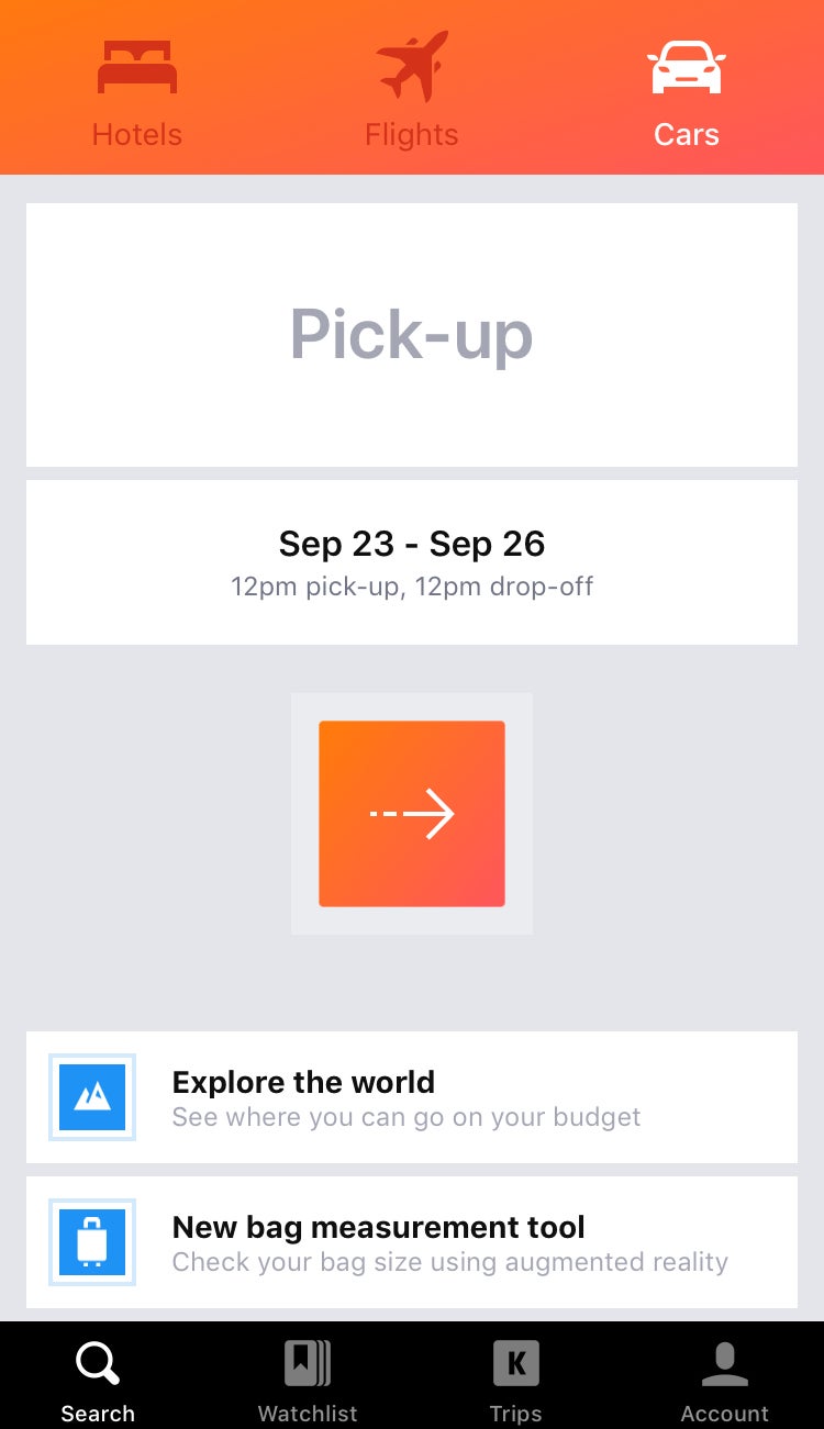 In order to utilize this handy feature, you'll first have to download the Kayak app. You don't need to sign in to Kayak or connect your account; just go directly to the bottom left on the home screen and select "Search." Scroll down to the bottom of the page until you see a button that says "New bag measurement tool."