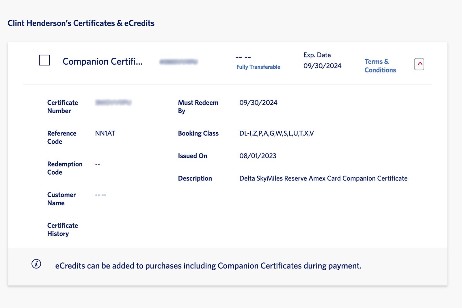 For the Delta SkyMiles Reserve cards, the companion ticket can also be used for first class, Delta Premium Select and Delta Comfort in addition to economy — that's the A, G, I, S, W and Z fare classes. Note that you can only use the certificates in first class or premium economy when eligible economy classes (L, U, T, X or V) are available.