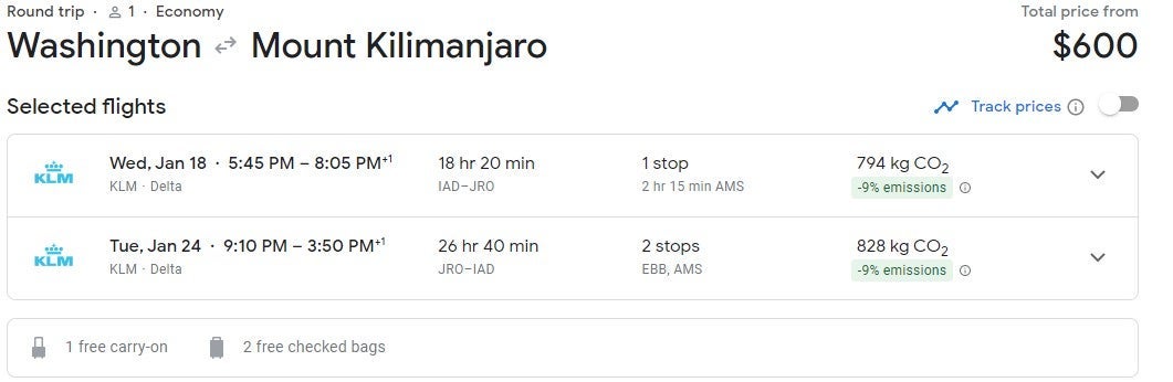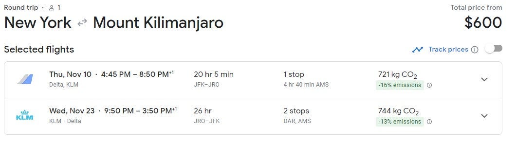The sample $600 itinerary above, on codeshare Delta/KLM flights between JFK and Tanzania, involves a stopover in Amsterdam in both directions. The return route requires an additional stop at the airport in Dar es Salaam.