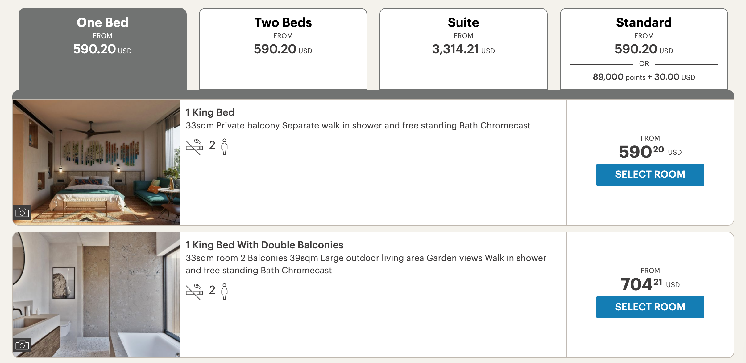 Right now, early rates for the Kimpton Aysla Mallorca appear to start around $590 per night for a standard room with king bed and upward of $3,300 for the presidential suite. For 89,000 points and $30, you can get an Essential Room, which is an entry-level room without a guaranteed bed type.