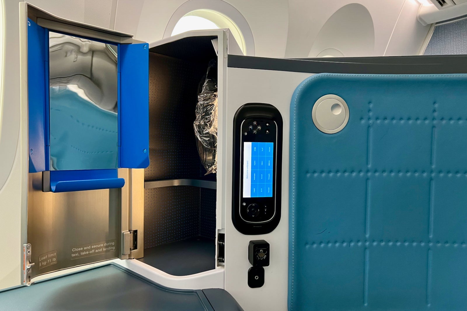 KLM's business class on the Dreamliner is arranged in a reverse-herringbone 1-2-1 configuration, with direct aisle access for each of the 30 passengers. The color scheme with blue paneling and navy seat covers exuded quiet elegance.