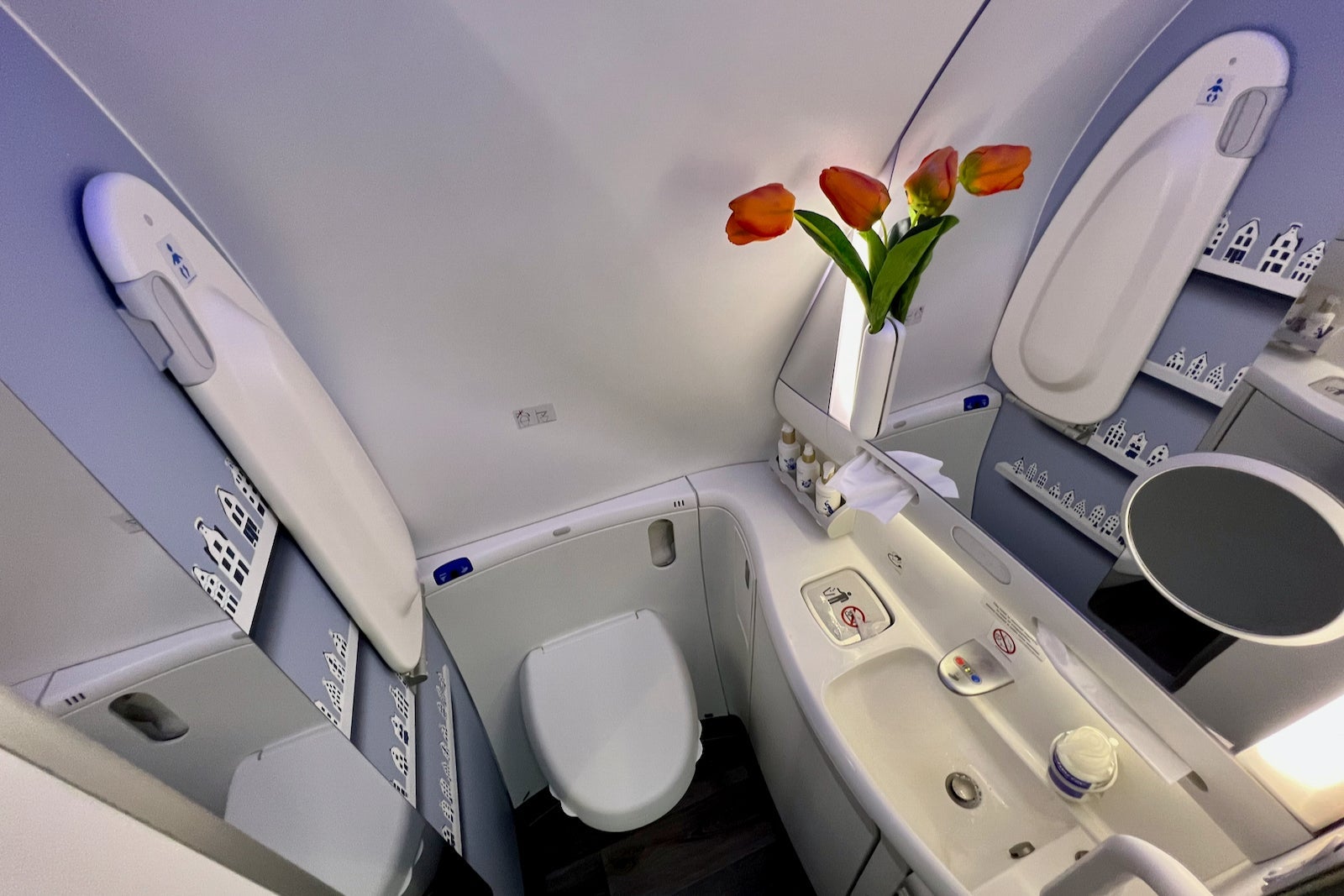 There were two lavatories for the business-class passengers, both located at the front of the cabin. Each was standard-sized, but I especially appreciated the Dutch design motifs, including the Delft house wallpaper and orange tulips.