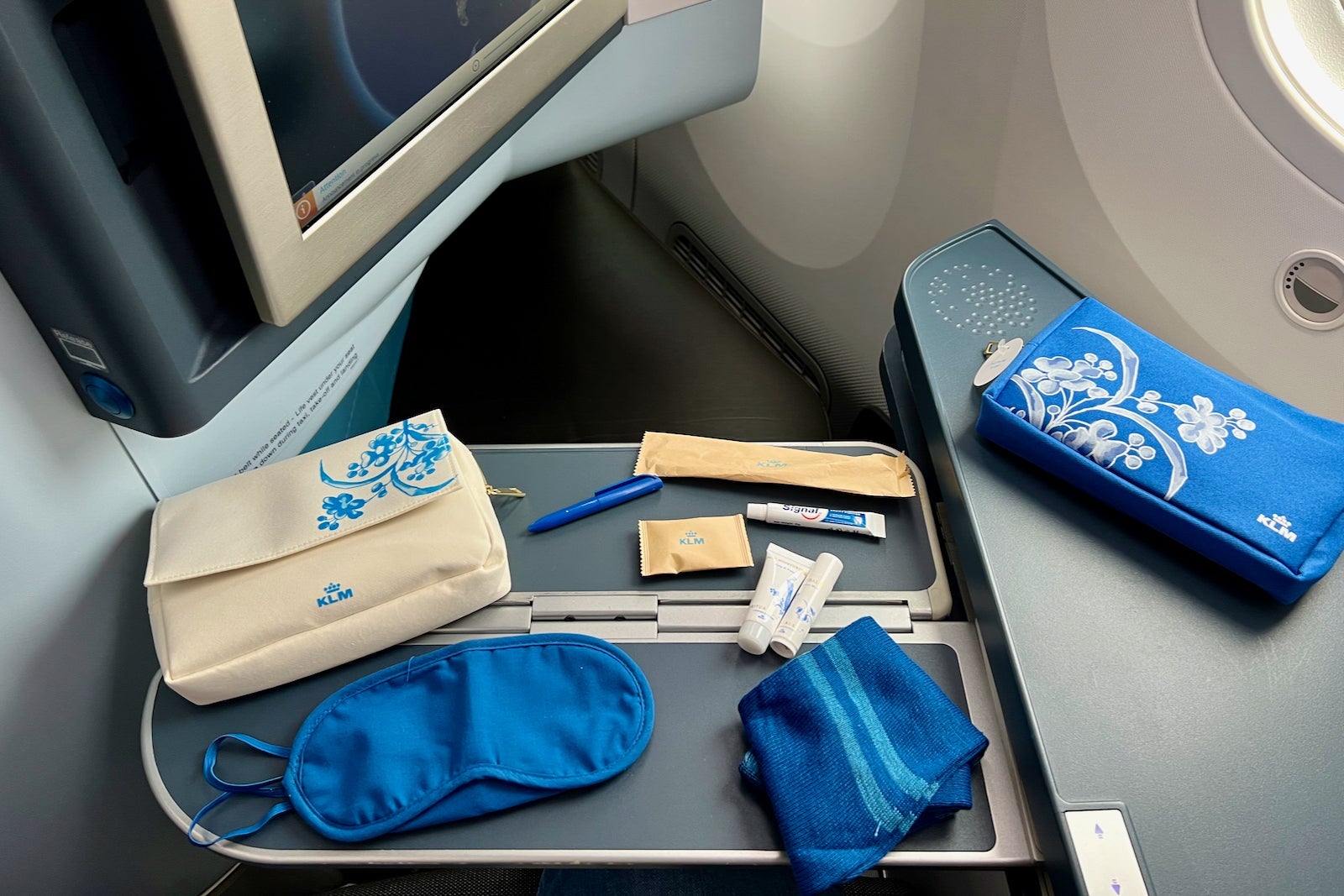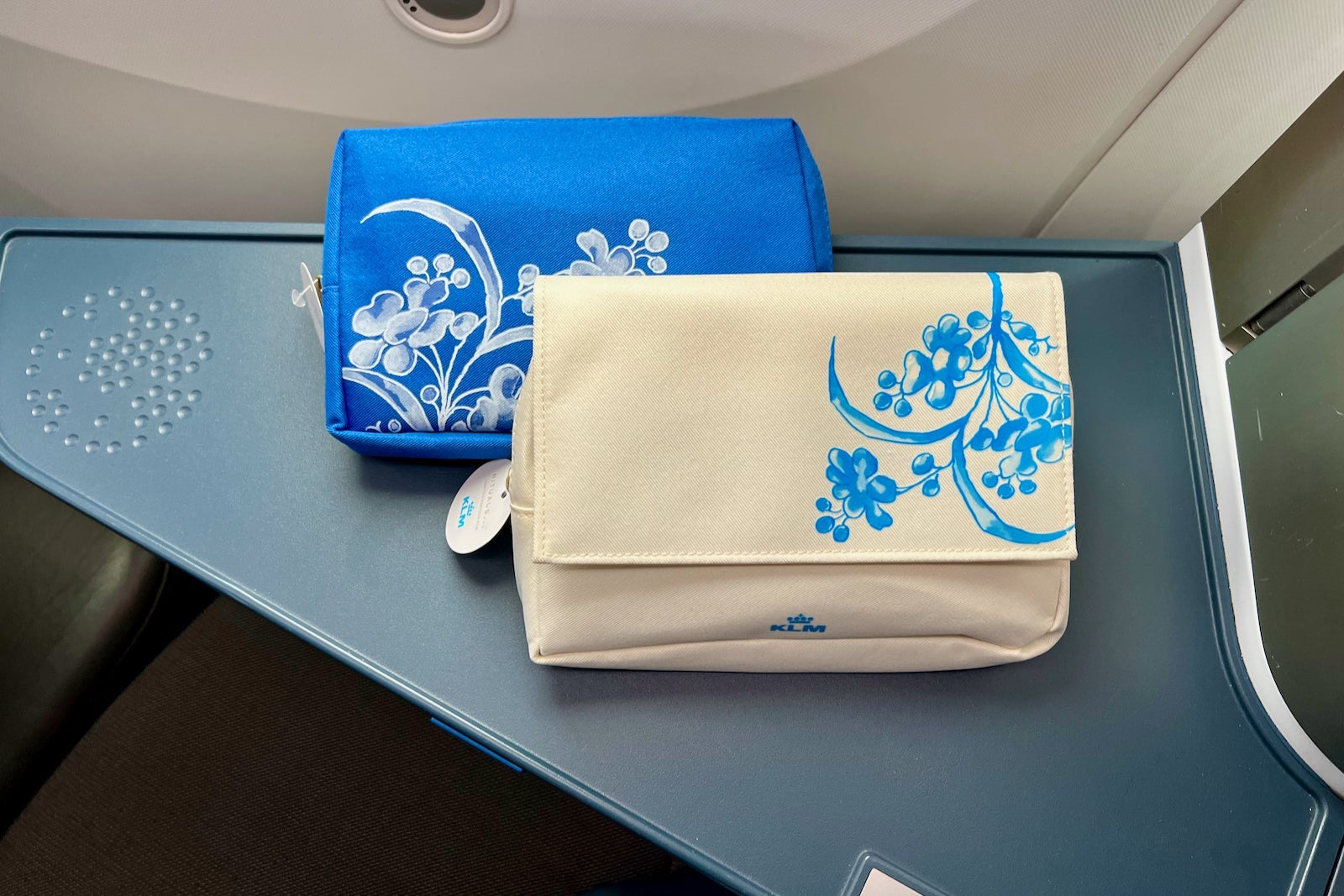 After my visit to the cockpit, I returned to my seat only to find the airline's two long-haul amenity kits waiting at my seat (one for departures from Amsterdam and one for flights to the airline's hub).