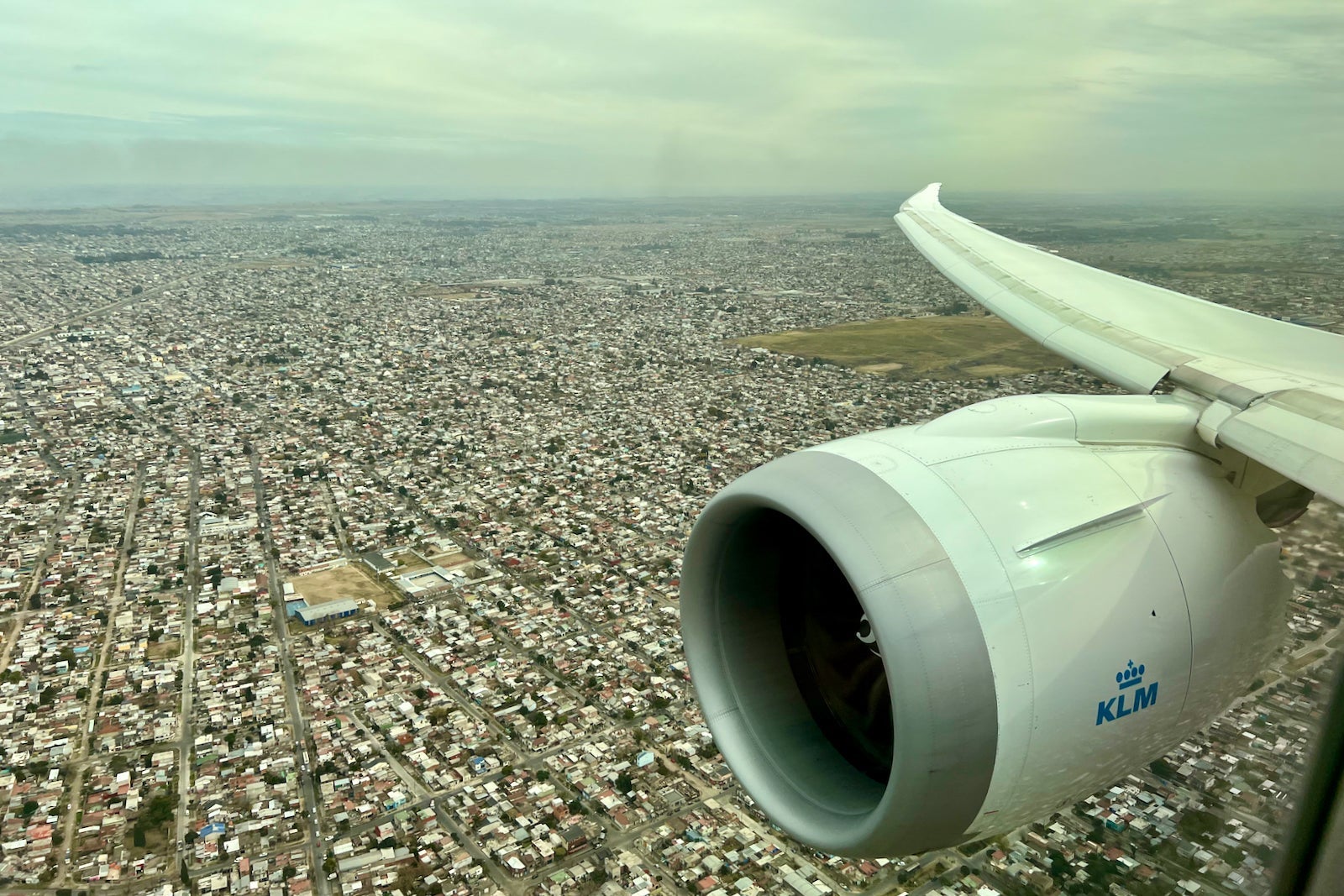 Before long, we were descending into Buenos Aires. I took one more look outside the window and caught a shot of us passing over the city's suburbs with the Dreamliner's GEnx-1B engine bearing the KLM logo.
