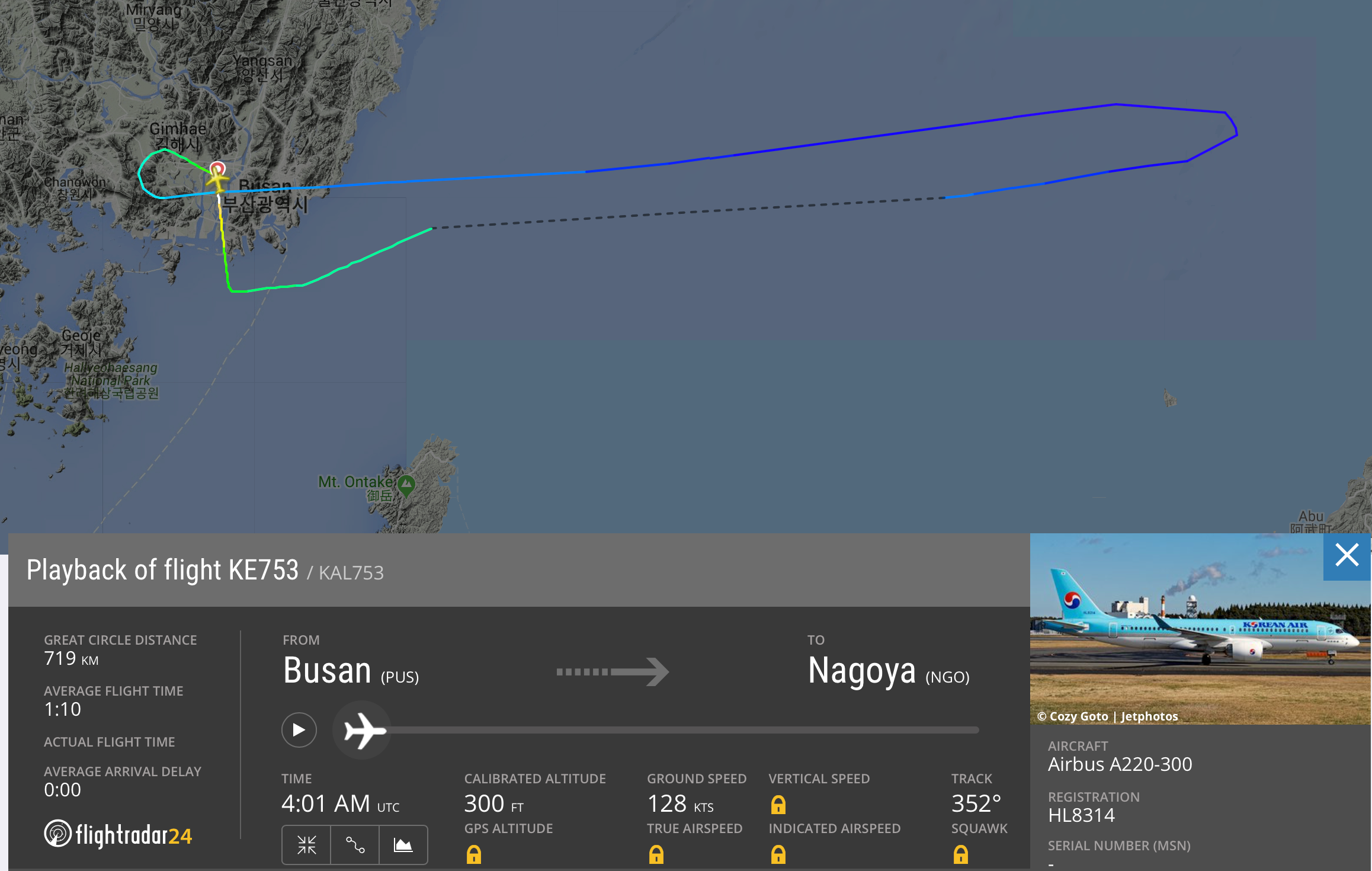 The flight from Busan to Nagoya could normally be completed in roughly one hour. However, the flight only made it about 25 minutes from Busan before being forced to return.