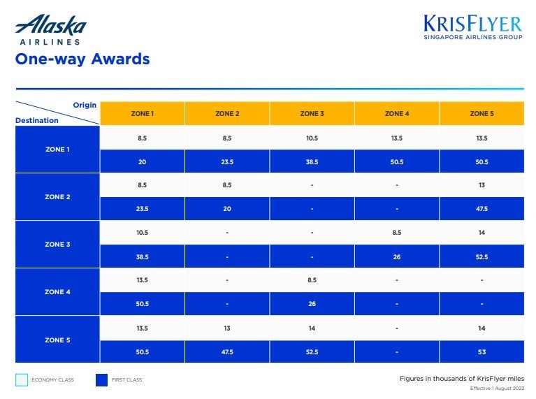 As an example, booking a one-way Singapore KrisFlyer award flight on Alaska Airlines from Zone 4 (which includes California to Hawaii and New York to California) to Zone 5 (Alaska and Hawaii) from Aug. 1 will increase in cost. Prices will go from the current 12,000 to 13,500 miles for economy and from 44,500 to 50,500 miles for first class.