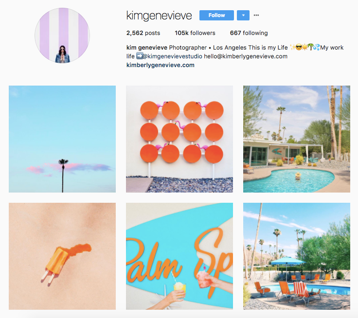 Originally from Canada, Kim Genevieve is a lifestyle and commercial photographer based in La La Land. Her unique aesthetic is comprised of bright color palettes and outdoor settings. It's clear this transplant knows how to blend in with the locals — you'll find beaches, colorful food and lots of palm trees populating her Instagram feed.